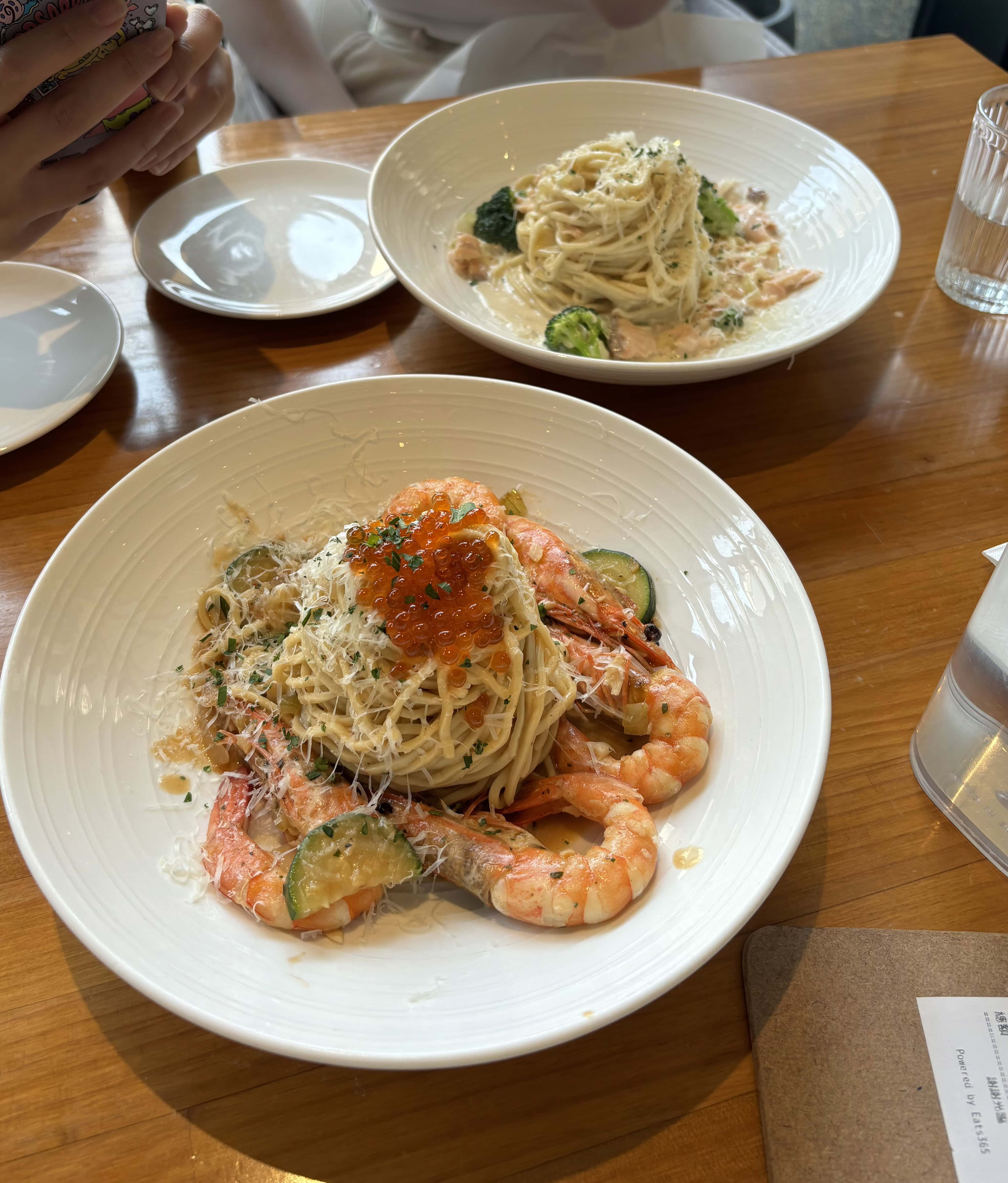 - 鮭魚卵鮮蝦汁義大利麵:Q彈的義大利麵條,加入長時間熬煮的蝦汁、白蝦拌炒,再放上鮭魚卵點綴,鮮味十足。
