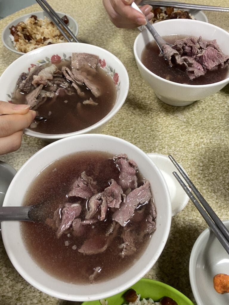 - 牛肉湯:湯頭清甜,牛肉鮮嫩(這趟台南行,牛肉湯直接成我最愛的美食),搭配肉燥飯享用,為在地人推薦的早餐選擇。我們早上七點前往,當天毛毛細雨,用餐期間來來往往的在地客沒有斷!