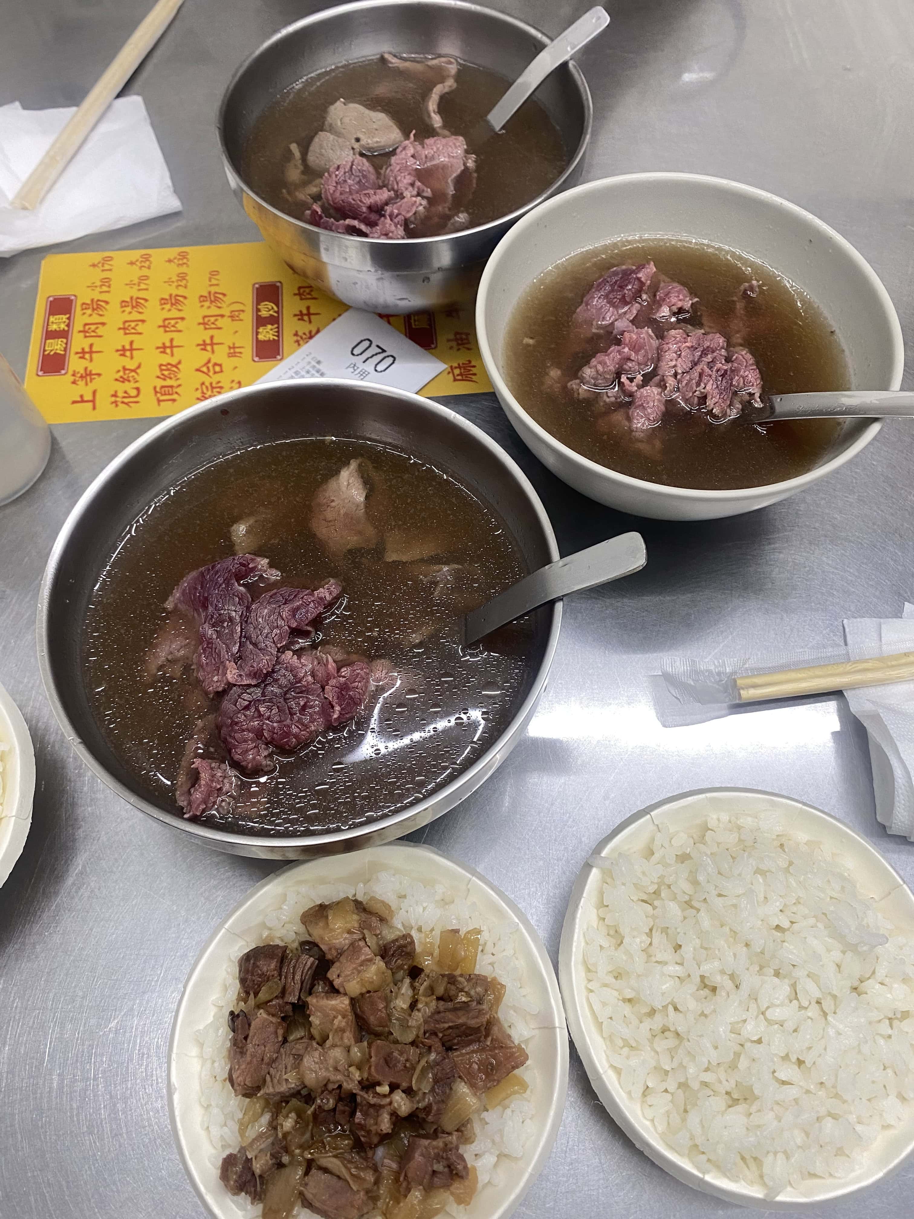 - 必吃:綜合牛肉湯(含牛心、牛肝、牛肉)、牛肉燥飯、芥藍炒牛肉