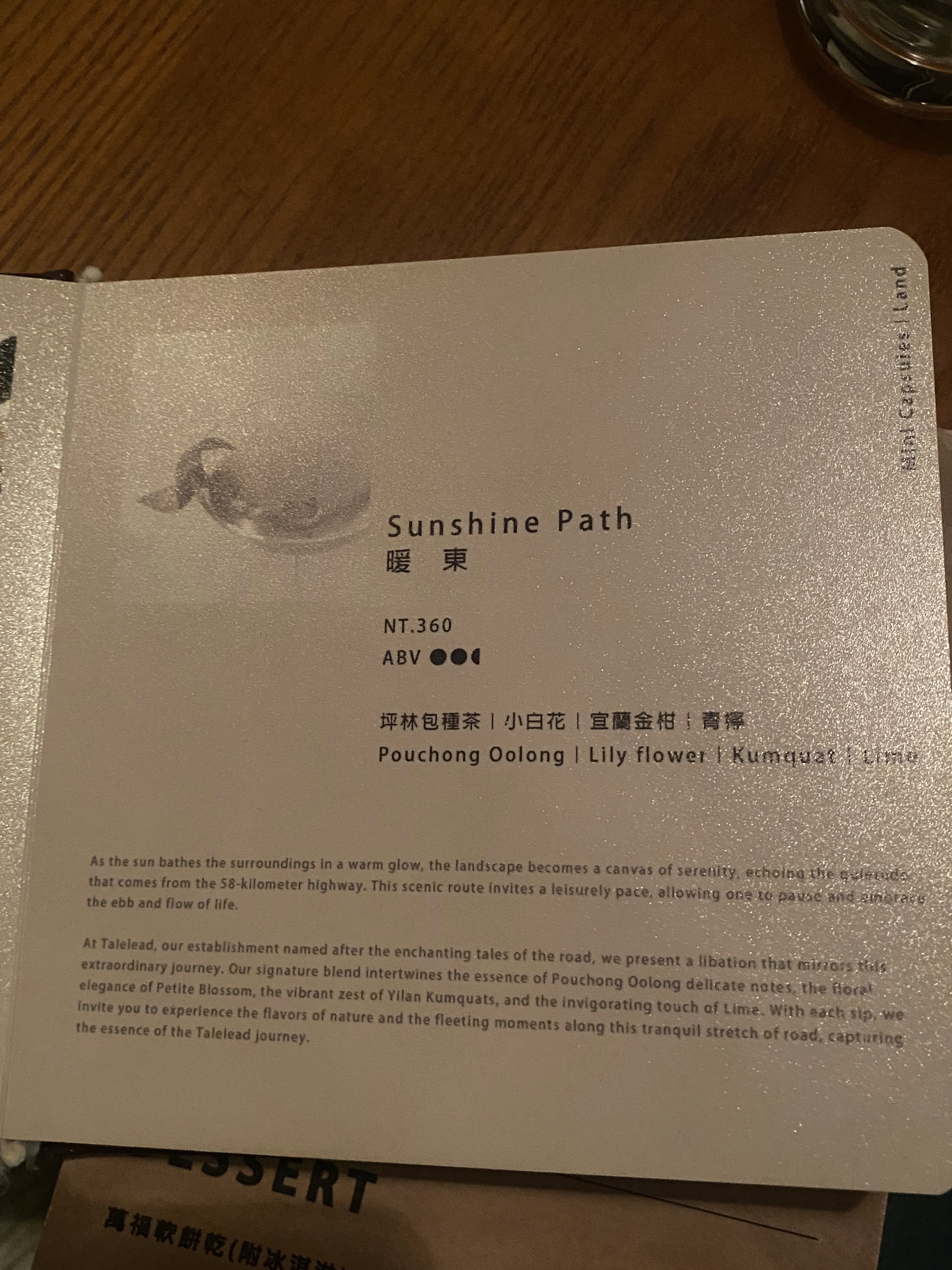 隱身於巷弄的 TALE LAND 主打「茶與酒」的完美結合,是將台灣在地茶香注入調酒的風格酒吧。空間氛圍溫暖安靜,適合與朋友小酌或獨自沉浸茶酒世界。每杯調酒都像說故事般細膩,茶香與酒感層層堆疊,很棒的一點是,調酒師會介紹每杯酒的故事與起源。我是週一前往、沒有提前預約,在外面等一下就讓我們入內了。