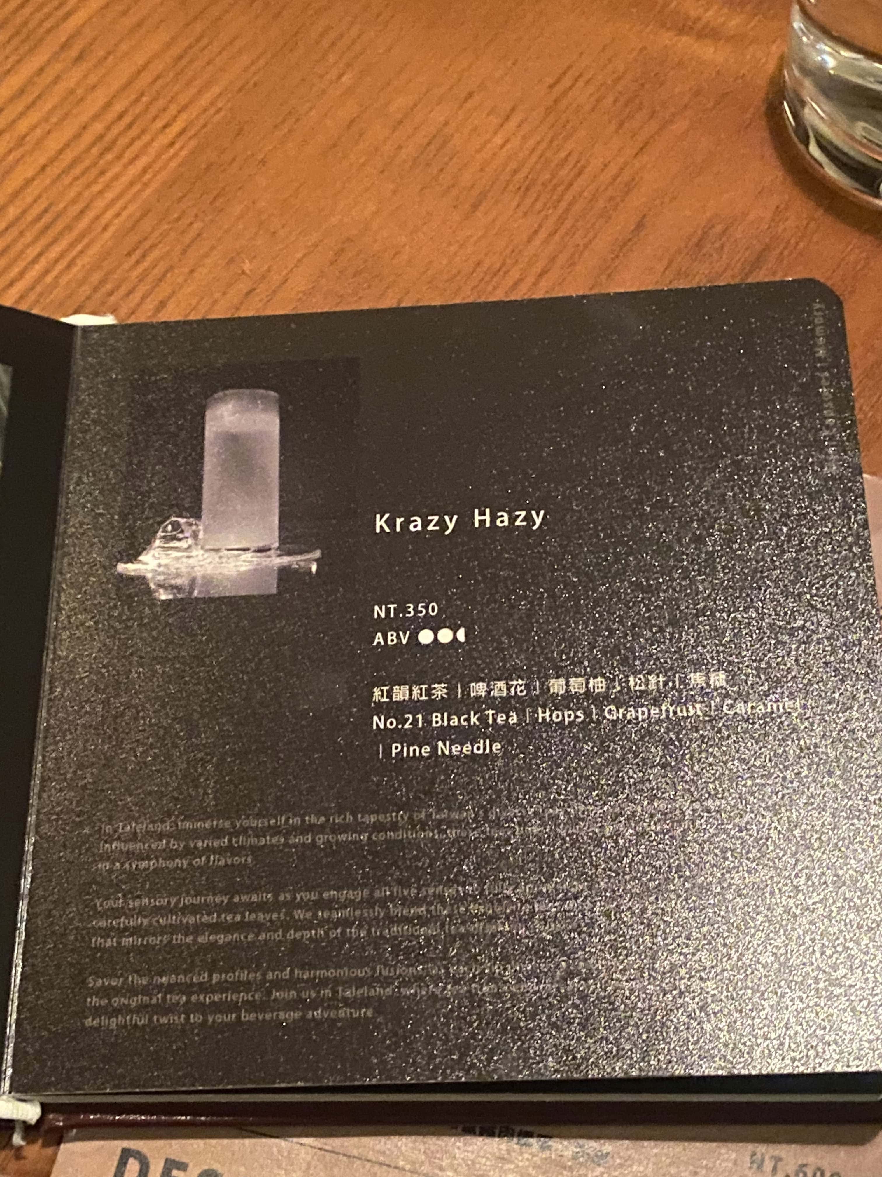 - Krazy Hazy ($350):紅韻紅茶、啤酒花、葡萄柚、松針、焦糖,也是具甜味的調酒。