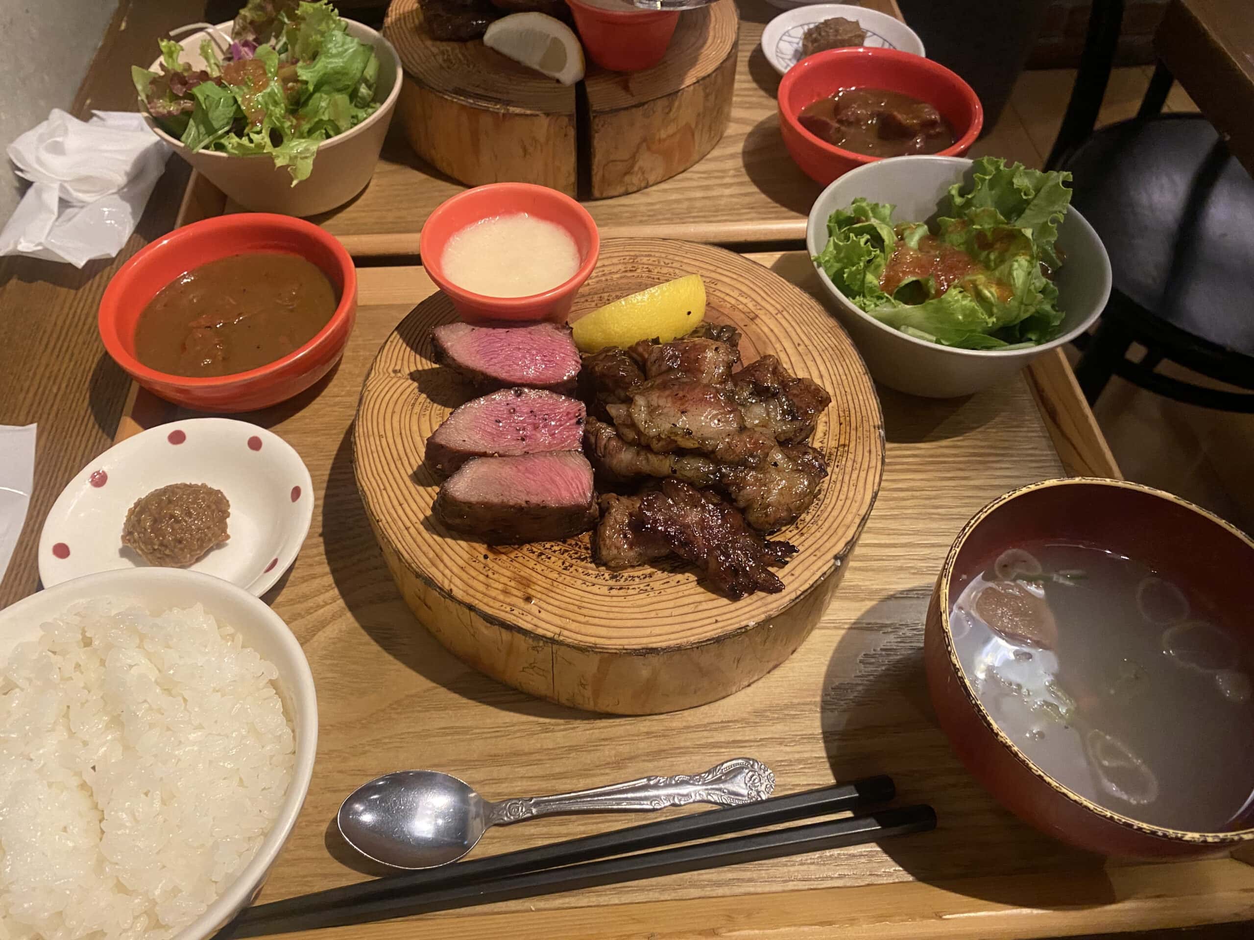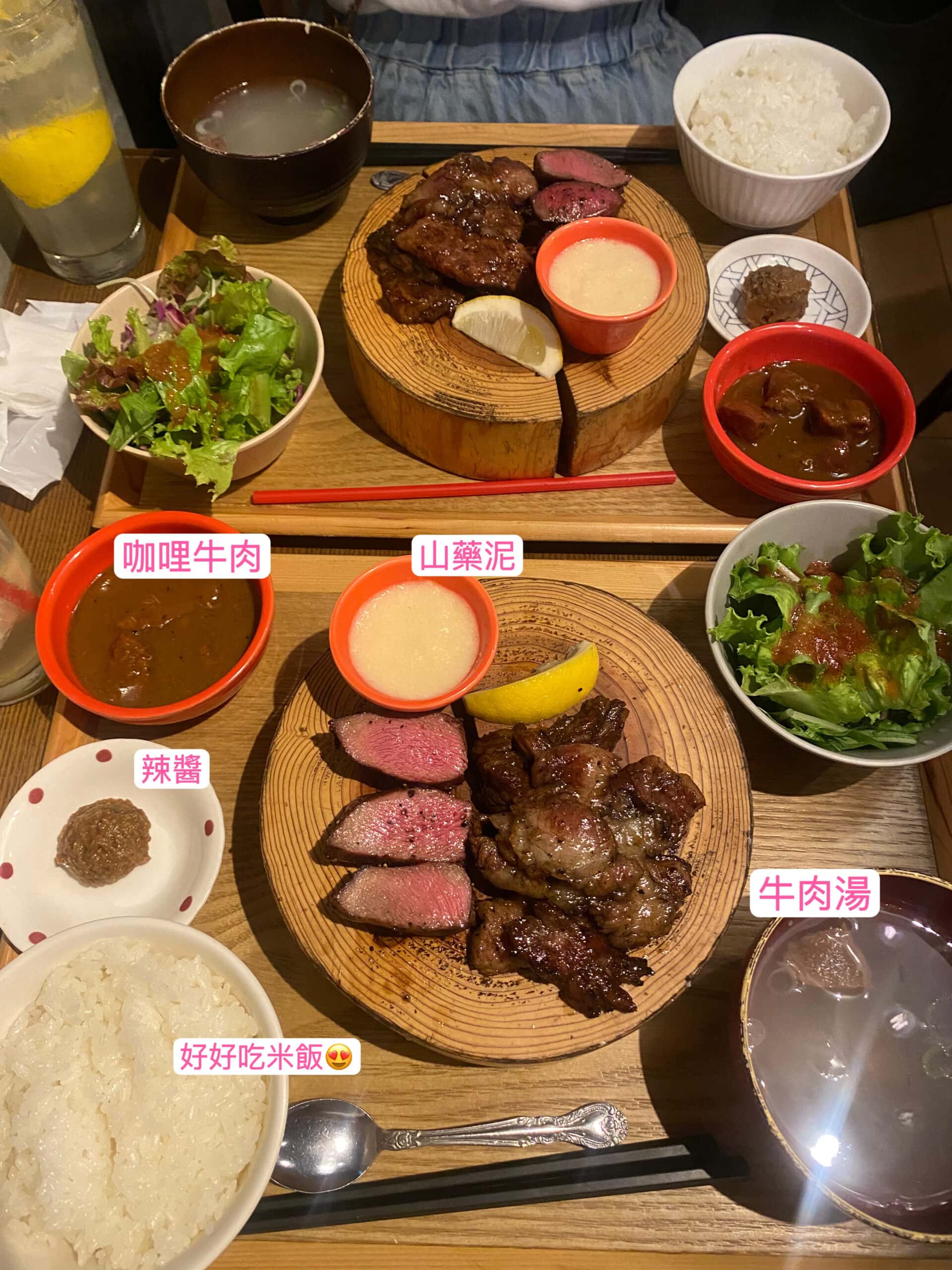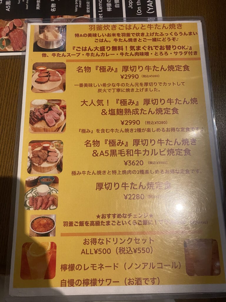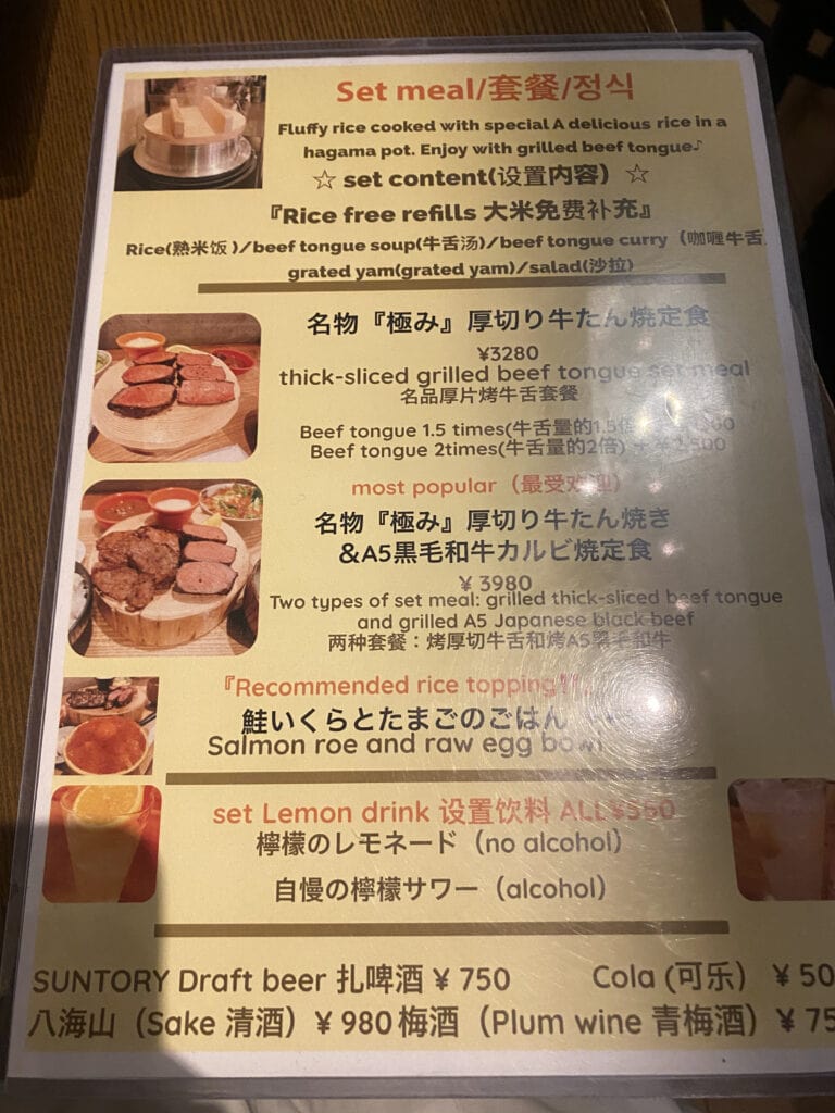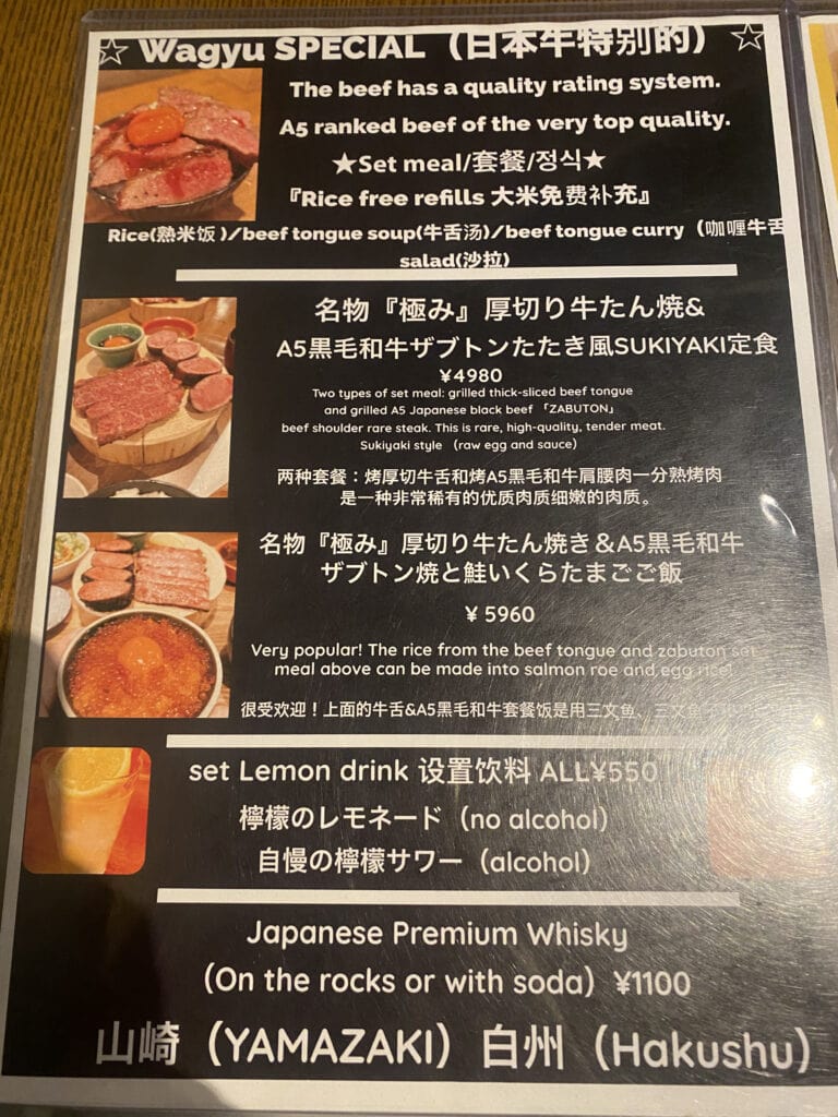 我和老王這次也都選擇厚切牛舌和A5黑毛和牛雙拼定食,3980日幣(約840台幣)+ 一杯檸檬沙瓦,650日幣(約140台幣),不用台幣一千就能吃到不用排隊的肉肉大餐❤️(撫慰了我們一整天的疲憊啊~~~)