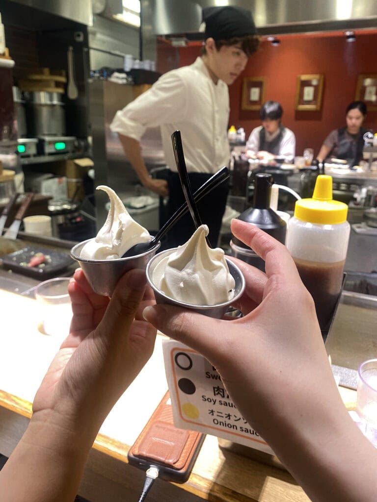 極味屋的招牌是伊萬里牛製作的「極味やハンバーグステーキ」,選用九州產黑毛和牛,配菜如米飯、沙拉、湯品和霜淇淋皆可無限加點,完全不用擔心吃不飽~桌上也提供多種沾醬,包括鹽、洋蔥醬、甘醬等,讓顧客自行選擇最佳搭配。老王也分享她愛用的、沾少量山葵醬享用漢堡排,可凸顯牛肉的甜美,這種輕盈的搭配是店內最推薦的吃法之一。