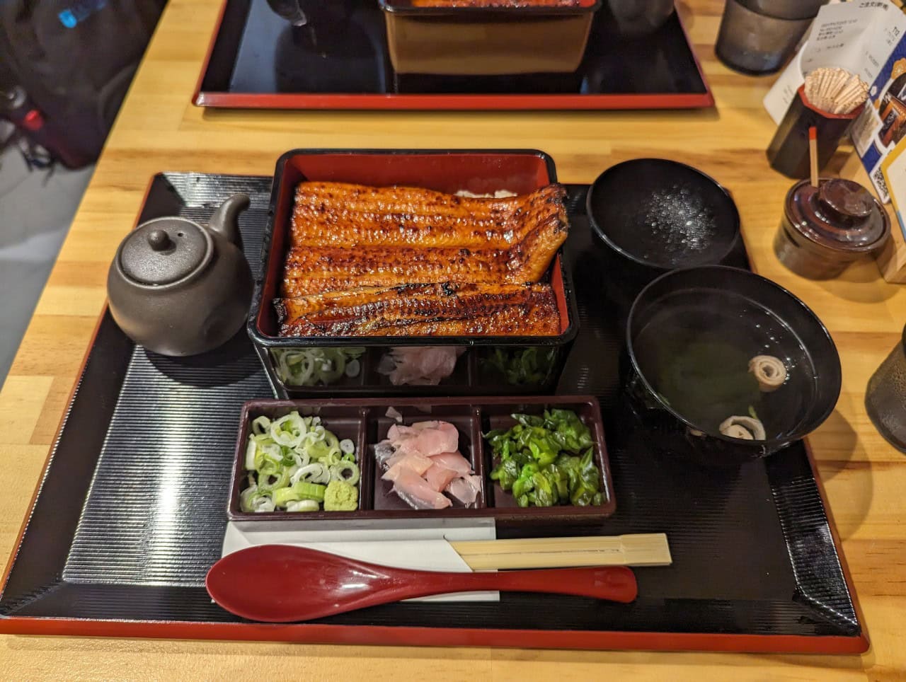 我們兩個這次都點了普通「竹套餐」,份量超級滿足!有些微的刺,老王有挑出來,我是覺得不會太影響食用(吃掉了:D)。套餐有一碗味噌湯、三樣醃漬小菜和一壺鰻魚醬汁,菜單有介紹各種鰻魚吃法(桌上的山椒粉很好吃,吃到後面很解膩)。最後還有小甜點!一人一個QQ的蕨餅😄