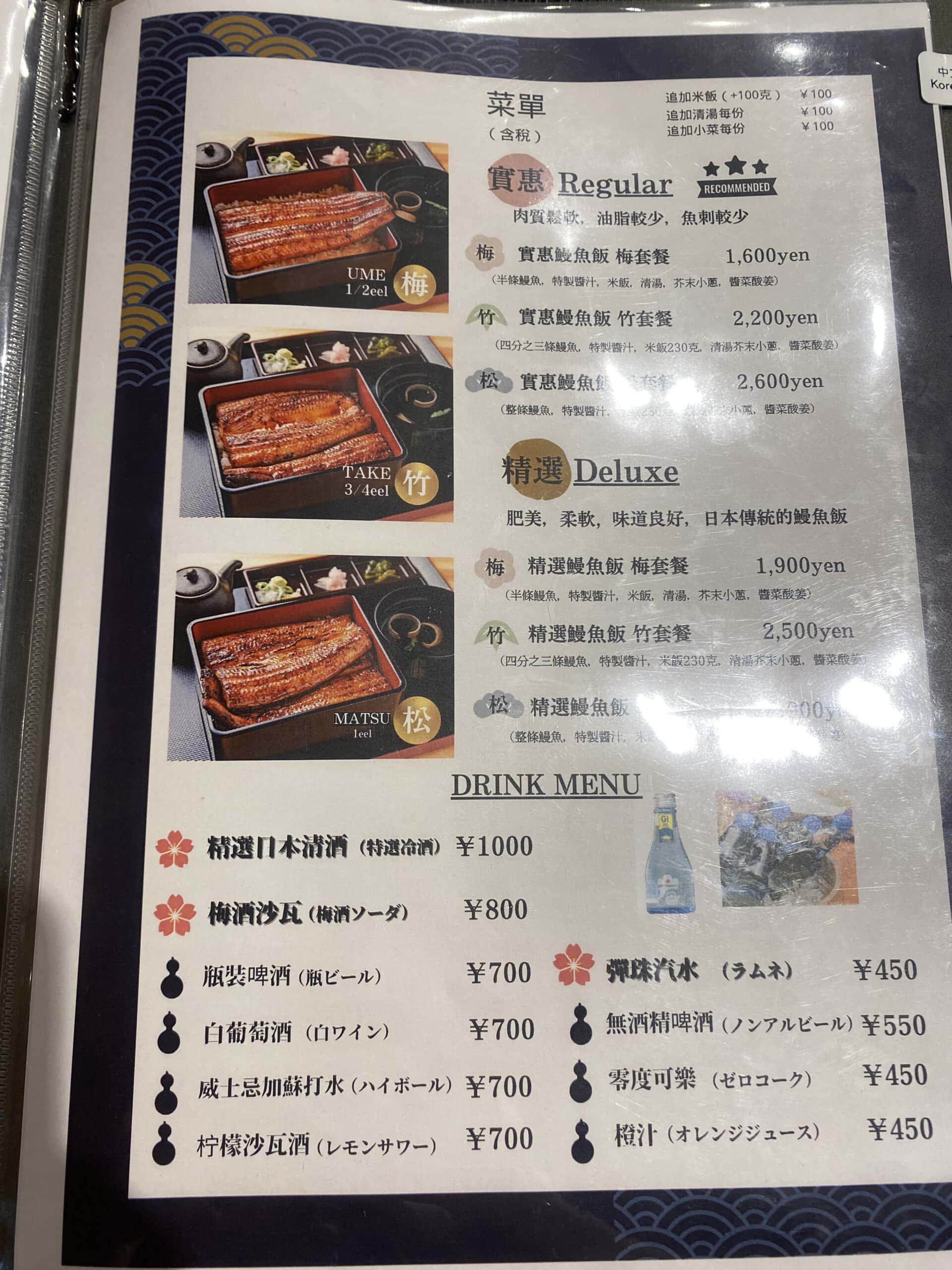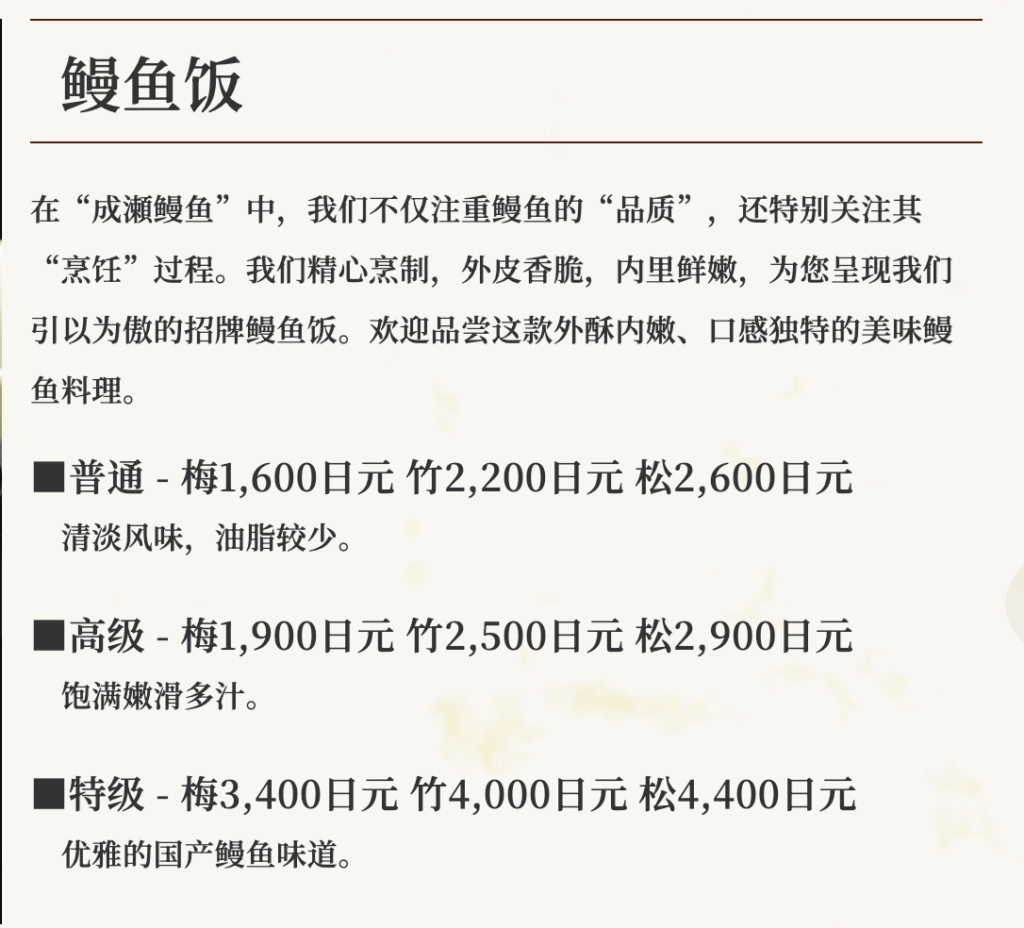 鰻の成瀬的菜單豐富且具彈性,最受歡迎的定食是「松」、「竹」、「梅」三款不同份量的鰻魚套餐,價格從1600日元起(340台幣可以吃到半尾分鰻魚!),價格非常親民。此外,店內還提供瓶裝啤酒、冷酒等飲品,顧客可輕鬆搭配鰻魚餐點。