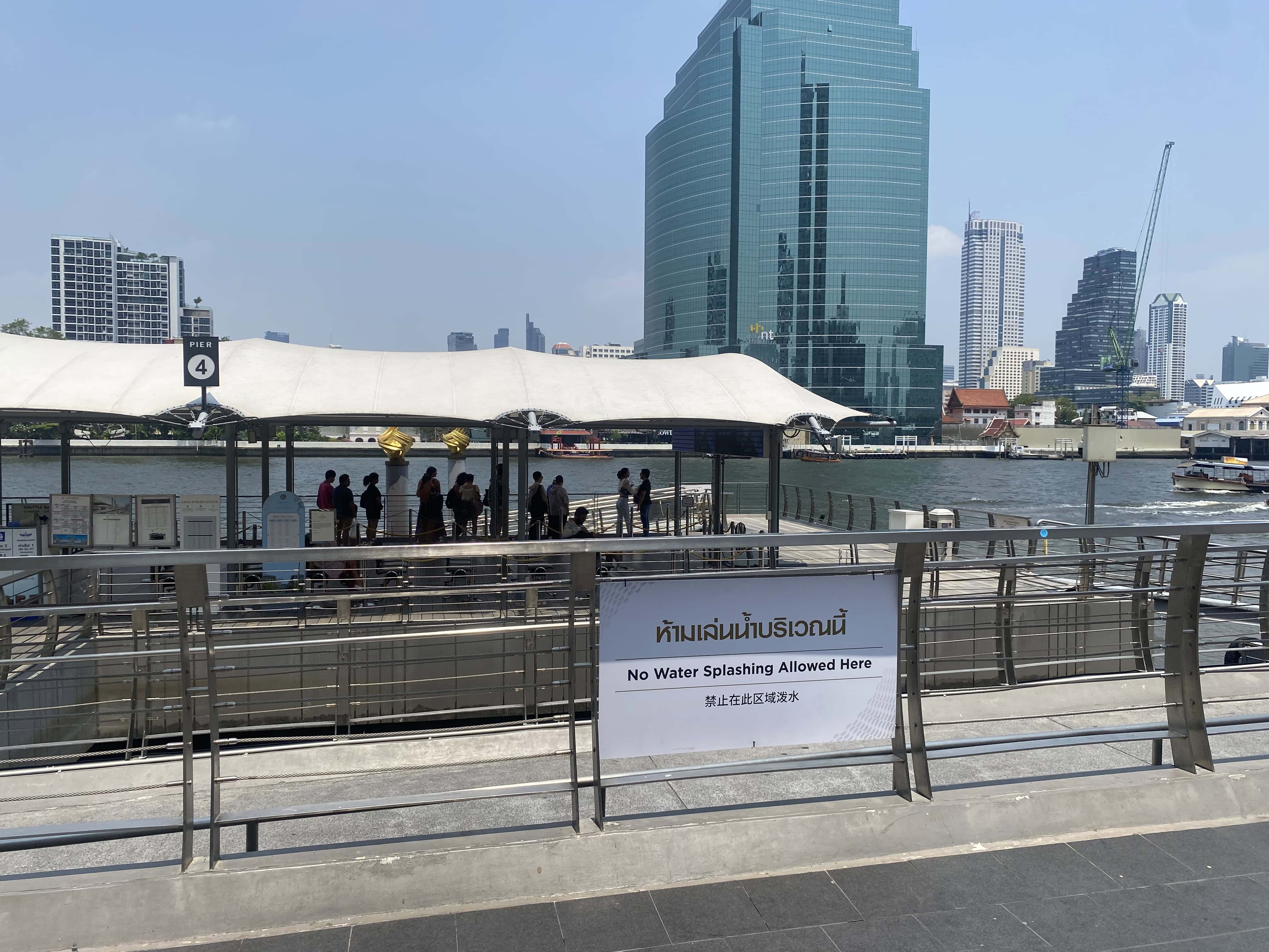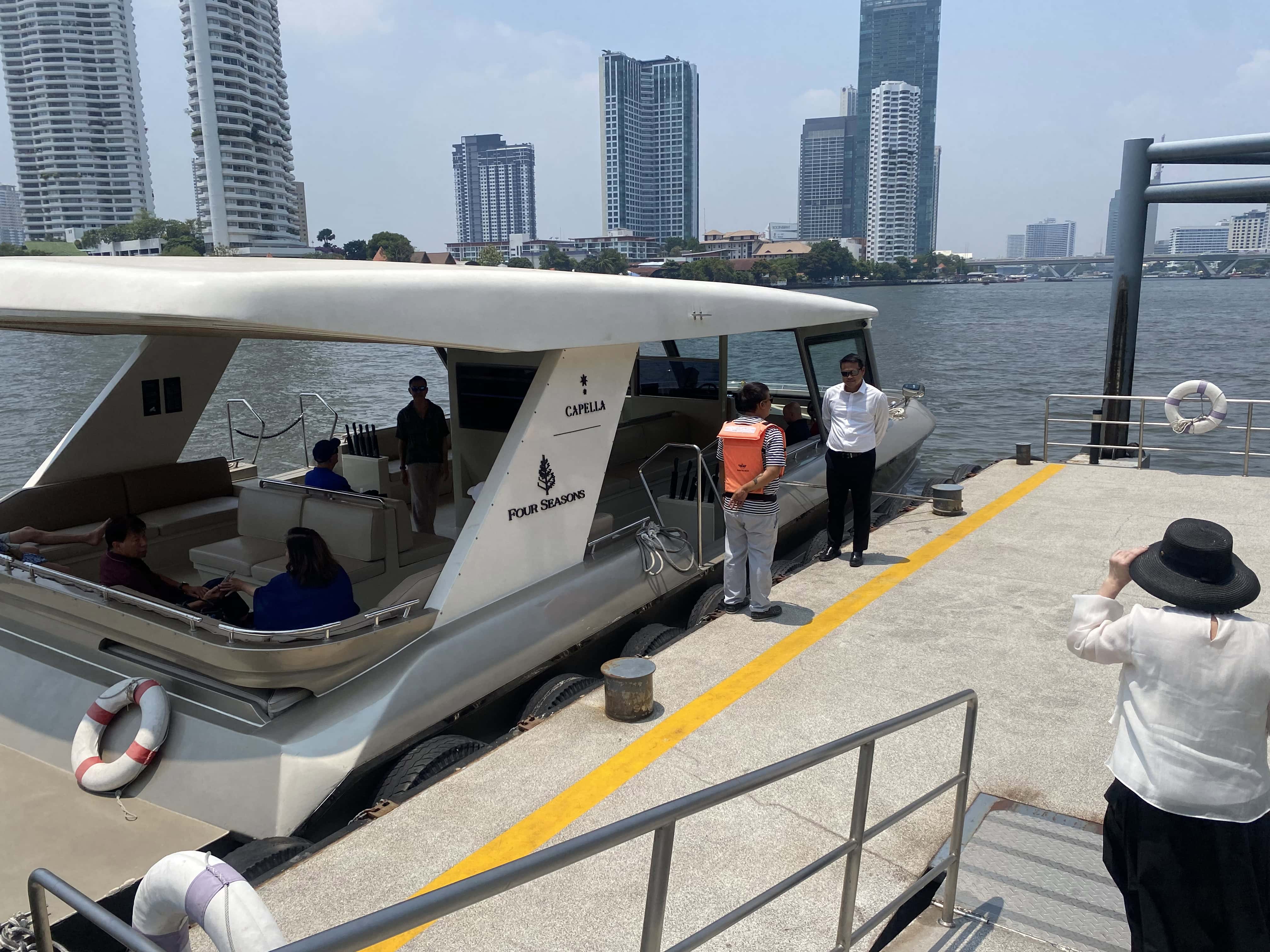 從Lobby穿過地下藝廊,出去後往河岸方向走,搭乘接駁船的地方在河畔旁邊的碼頭。接駁船每小時都有班次提供房客搭乘,總共停靠兩站:輕軌BTS Saphan Taskin站,和ICONSIAM購物中心。