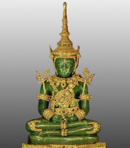 大雄寶殿(Chapel of The Emerald Buddha)裡供奉的玉佛(釋迦牟尼)由一整塊碧綠的翡翠雕成,高66公分,寬48公分,是泰國的鎮國之寶,進入參拜需要脫鞋,入口有專人指引排隊。
