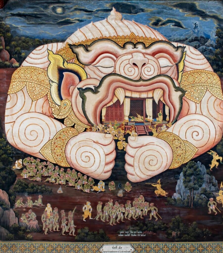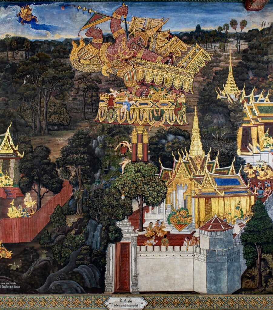 游廊環繞全部宗廟一周,游廊牆壁上的蛋彩畫描繪的是泰國傳統繪畫本《羅摩衍那》的神話故事
