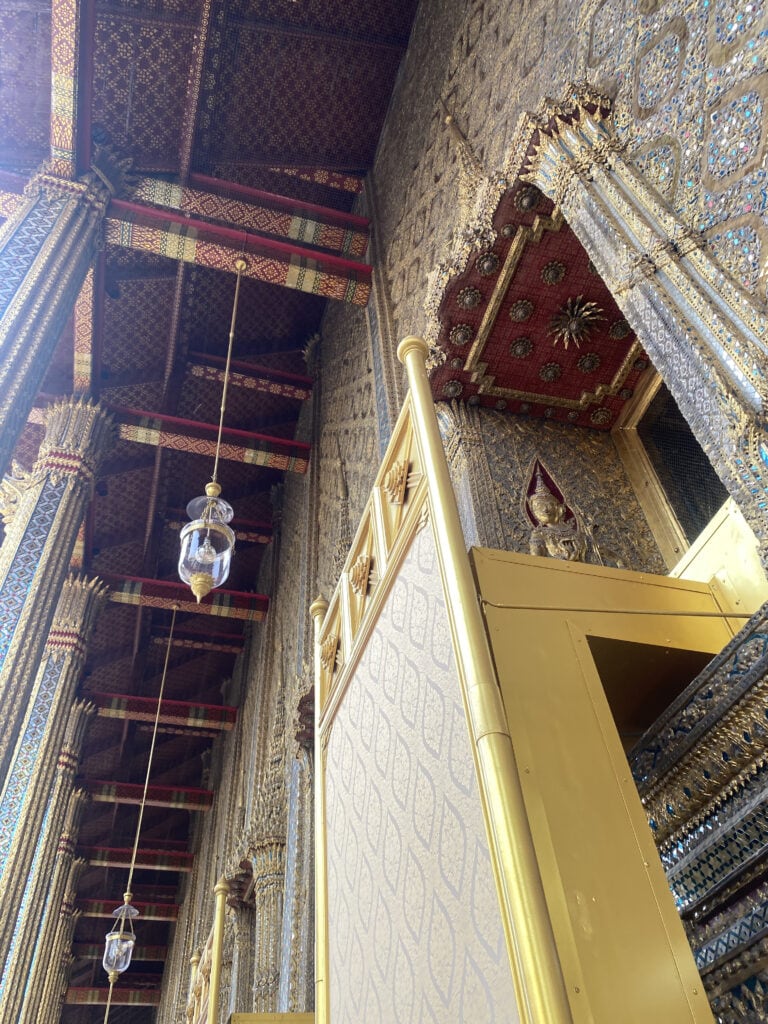 玉佛安放在蓮花底座上的純金佛塔內,姿態為禪定坐像,由整塊祖母綠雕琢而成。每年換季的時候,國王都會來幫玉佛更衣。室內禁止拍攝,人員會舉牌提醒,可以選擇坐在地上祈禱一陣或觀賞後隨隊伍離開。抬頭向上望,可見位處高處,在光線折射下閃閃發亮的玉佛,「晶瑩剔透」是我腦中蹦出的第一個形容詞,遠遠觀賞都非常壯觀!