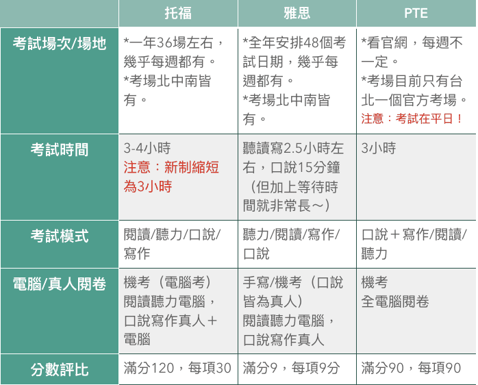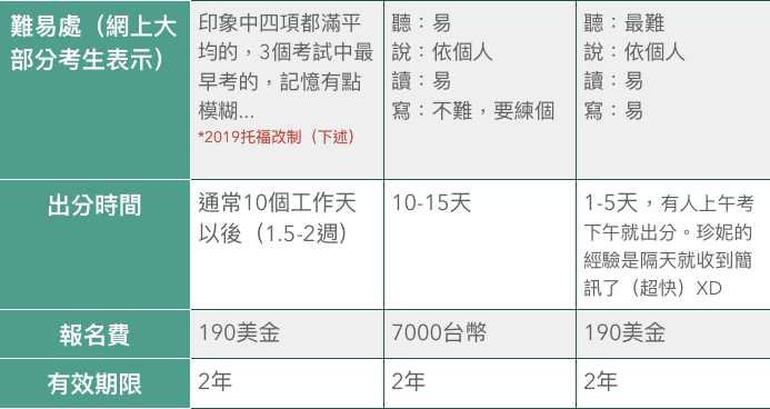 這三種考試,大概都密集地準備了1-1.5個月左右(看個人複習習慣與當前程度),主要備考流程都是認識考試模式後練題、檢討,從題目裡學習。以下,先附上簡易比較表再分項介紹這三個考試:
