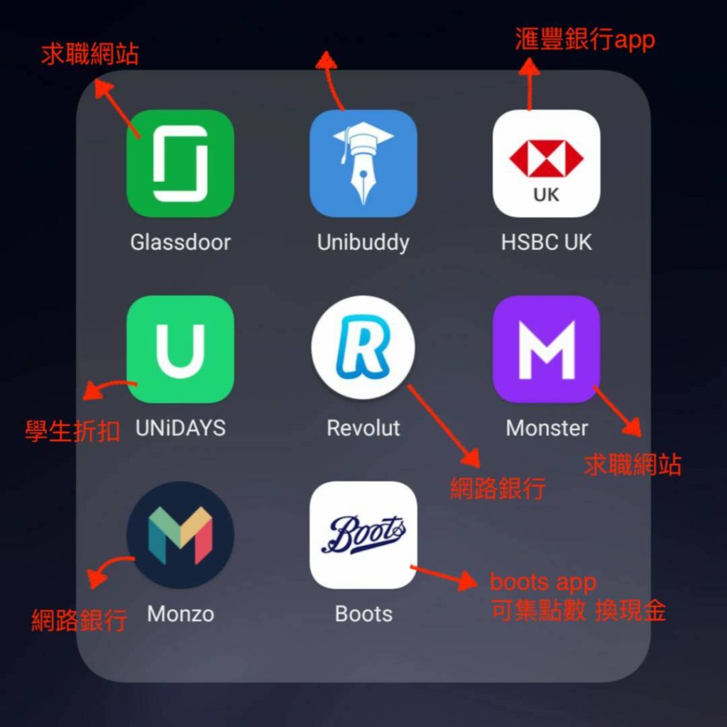 revolut與monzo之前有寫過一篇介紹,都是網路銀行(無實體),申請方便也頗快速,日常使用便利。unibuddy主要是關於大學生問題的一個論壇,可以在裡面看到關於宿舍啦、申請等等的主題討論。boots是英國大型美妝生活用品店,他們的app下載後,每次去boots購物記得刷app條碼,就可以累計點數、並換成現金回饋~最後,unidays是學生必下載的一個app!裡面有各式各樣的學生優惠,像是體育用品nike、addidas不定期折扣、美妝衣服外,美食也都會有打折~