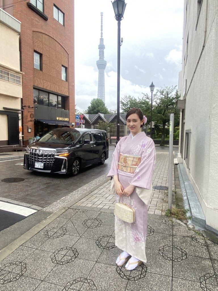 我和老王在和服陣裡選喜歡的布料,老王打算體驗大正蕾絲和服,並在顏色上糾結。訪問服相對普通和服或浴衣的選擇相對沒那麼多,加上我來之前就有大概看過浅草愛和服官網和臉書/IG的和服款式,滿快就選好一件粉紫色的訪問服。接著便被領去後方、換上白色內裏、做髮型(先選髮型再選髮飾),做完髮型後便開始著裝(裡面皆禁止拍照)。