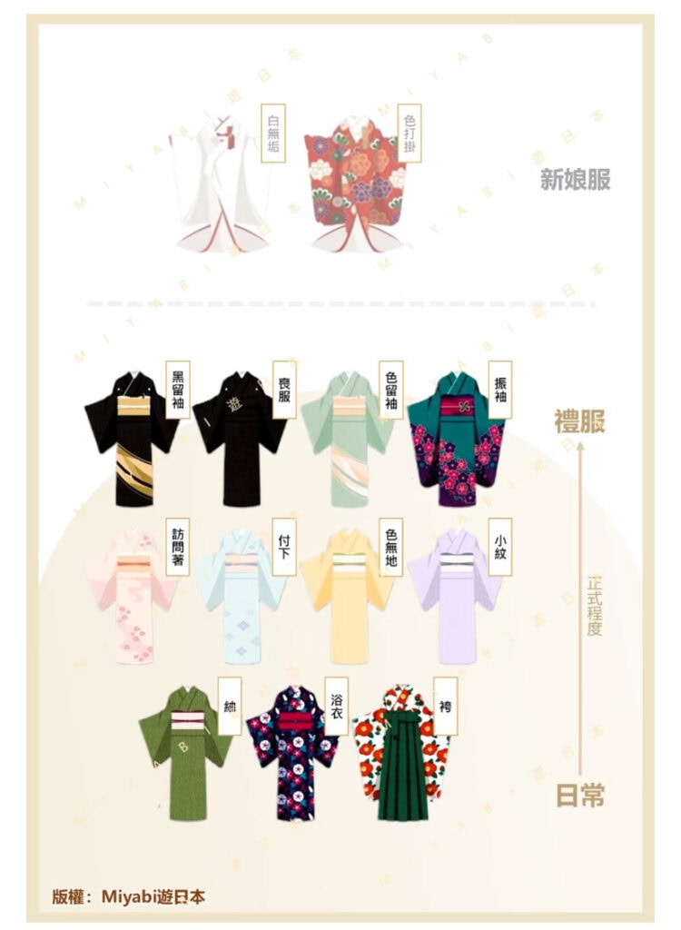 • 用途:浴衣是最休閒的和服款式,通常穿於夏季祭典、煙火大會等場合。