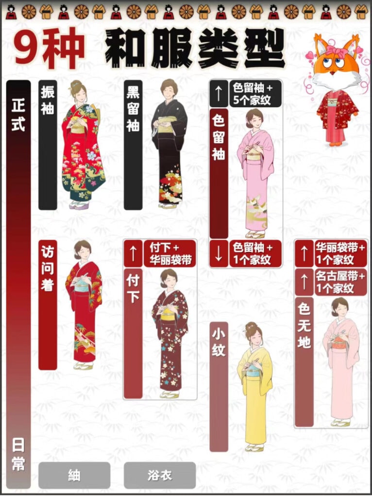 • 用途:多見於畢業典禮、武道或茶道活動中。袴分為「馬乗袴」(褲腳分開)和「行燈袴」(類似裙子)。