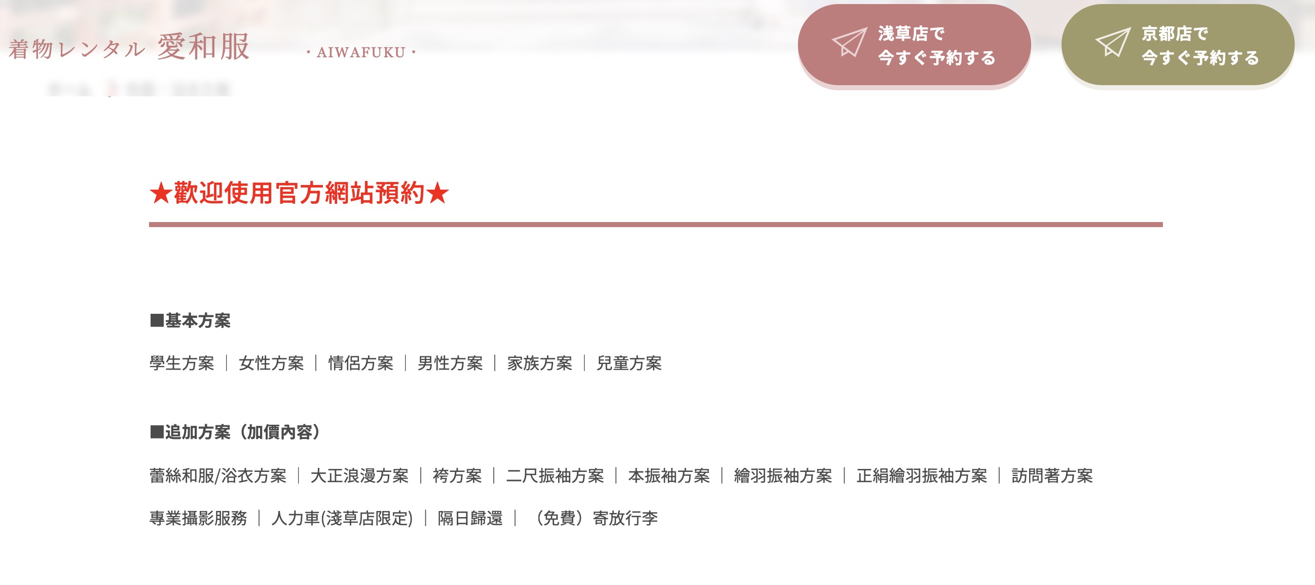 • 各方案費用這邊看:淺草女性基本方案費用4,300円(含稅),再依不同款式&服務追加費用