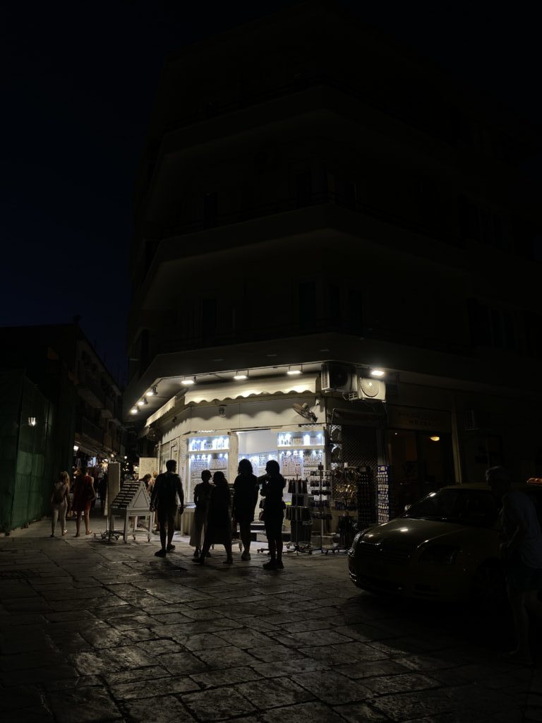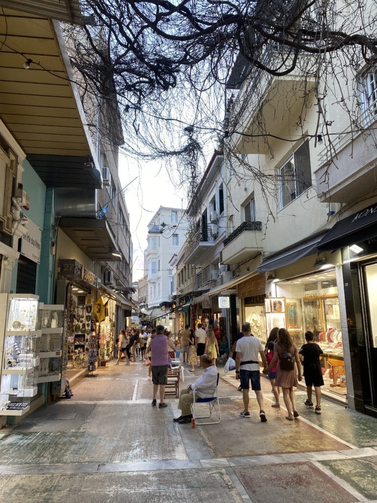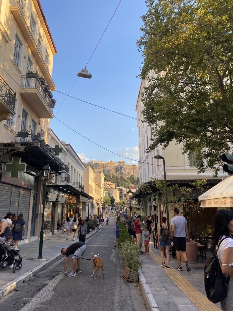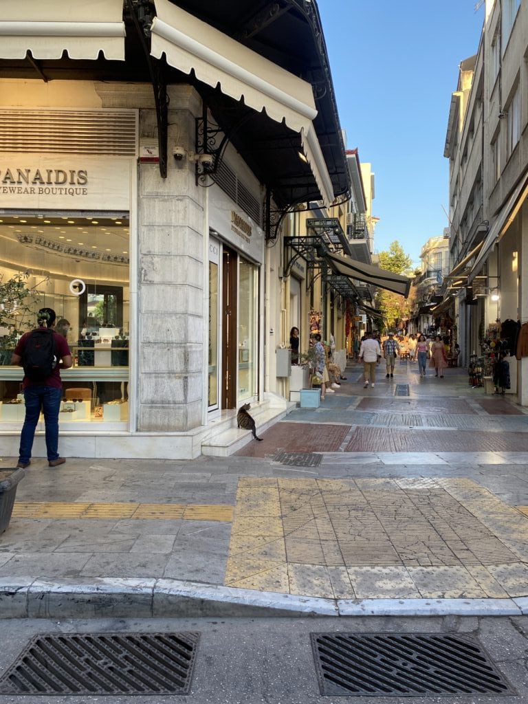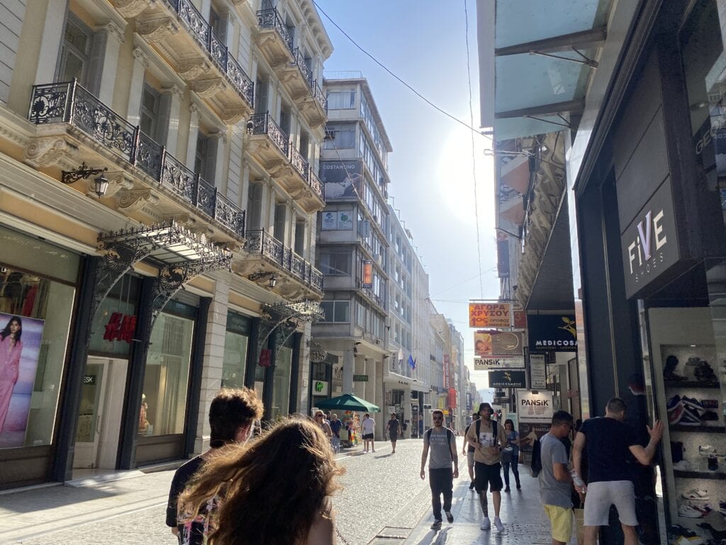 憲法廣場對面是 Ermou 街(女人街),是逛街好去處的精品街,繼續往下走會經過教堂、古蹟群等。必逛品牌:Zara, H&M, Mango 這裡都有,還有希臘本土百貨 Fokcas。巷弄裡藏著很多好吃的 Loukoumades (希臘炸球),淋上蜂蜜和肉桂粉,是看完衛兵後最棒的下午茶點心。我們到達飯店後來到街上吃晚餐,黃昏下的 Syntagma 區好美,抬頭還能看見山頂上的衛城,被金黃色的夕陽映照的閃閃發光。想到萬年前的古人,當他們抬頭看向神殿時,不知道是不是也曾被這樣莊嚴神聖的景致震撼?