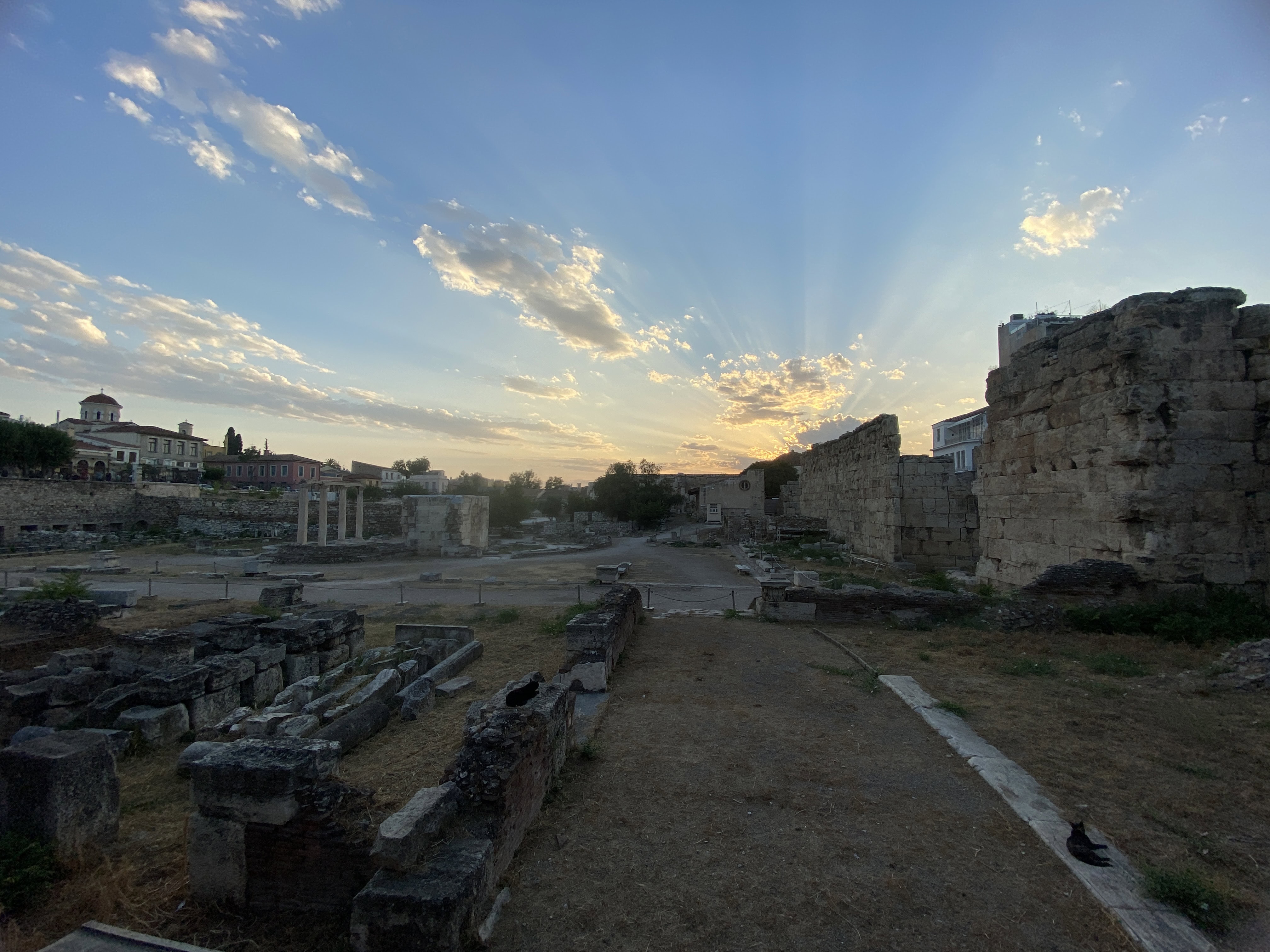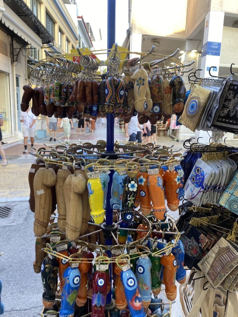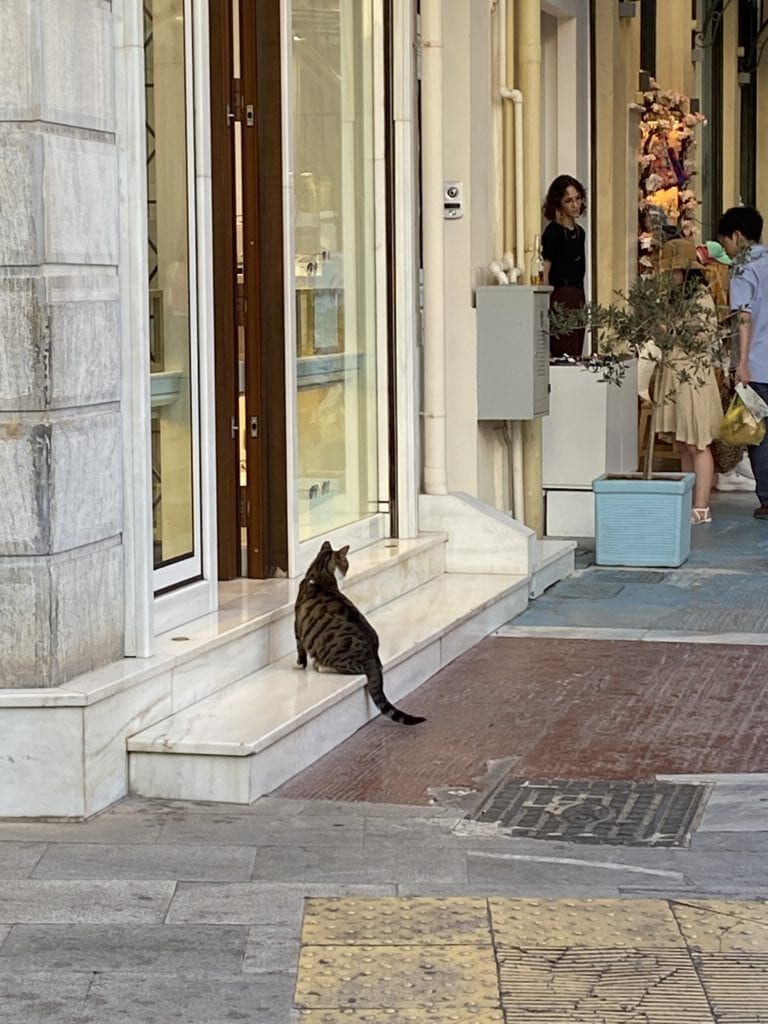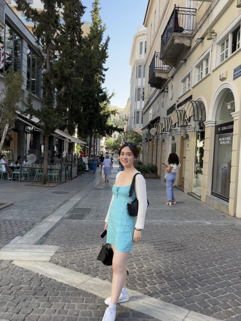 憲法廣場對面是 Ermou 街(女人街),是逛街好去處的精品街,繼續往下走會經過教堂、古蹟群等。必逛品牌:Zara, H&M, Mango 這裡都有,還有希臘本土百貨 Fokcas。巷弄裡藏著很多好吃的 Loukoumades (希臘炸球),淋上蜂蜜和肉桂粉,是看完衛兵後最棒的下午茶點心。我們到達飯店後來到街上吃晚餐,黃昏下的 Syntagma 區好美,抬頭還能看見山頂上的衛城,被金黃色的夕陽映照的閃閃發光。想到萬年前的古人,當他們抬頭看向神殿時,不知道是不是也曾被這樣莊嚴神聖的景致震撼?