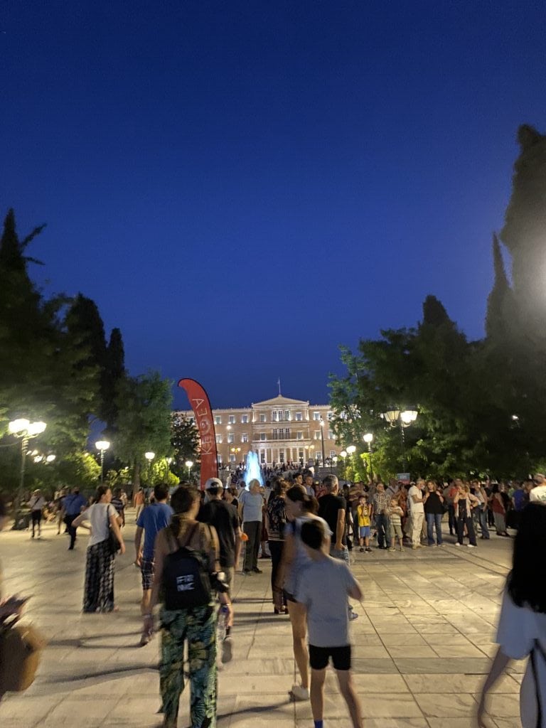 憲法廣場(Syntagma Square) 位於雅典市中心,無論是慶祝或悼念等大型活動都會在此舉辦,為了紀念1834年,在此廣場頒布的憲法而建,因而取名為憲法廣場。是當地居民重要的休閒區域,常有民眾在此散步、休憩,我們這次晚間路過也看到正在廣場曲半的小型演唱活動(用google翻譯看,似乎是關於關懷戒毒者的公益活動)。