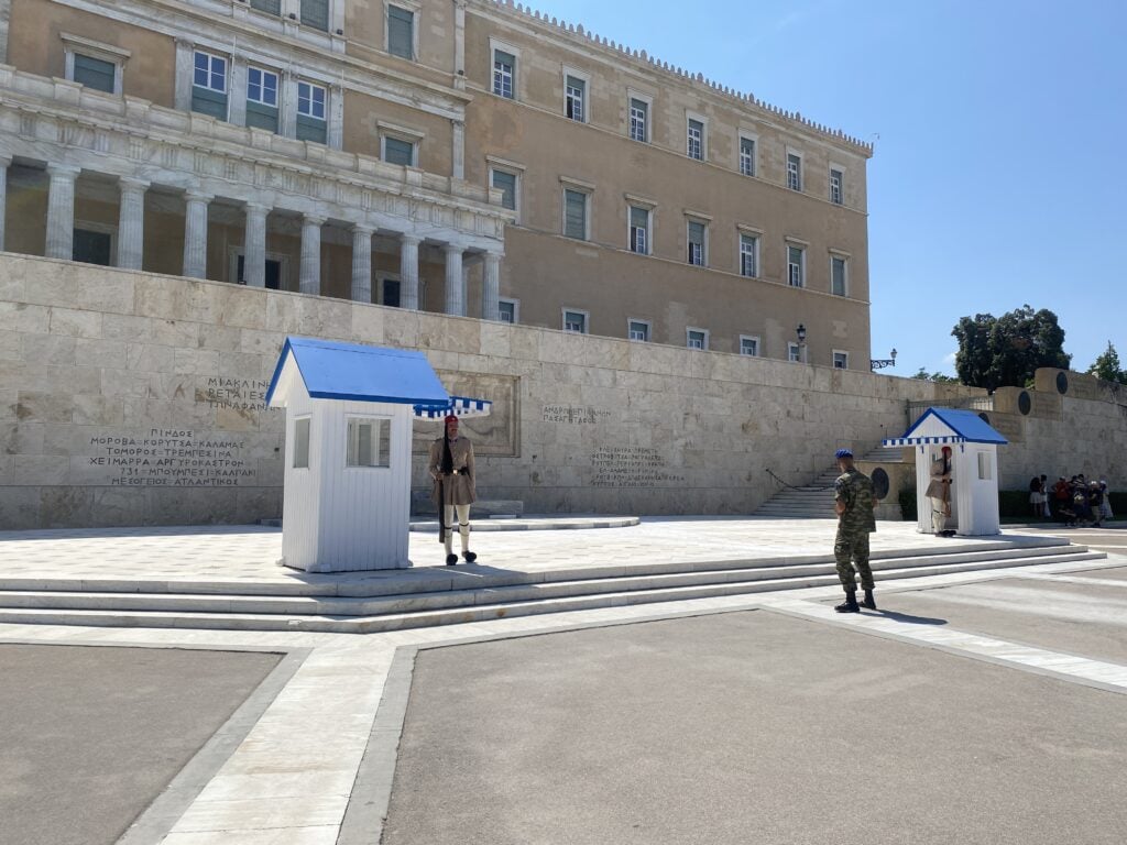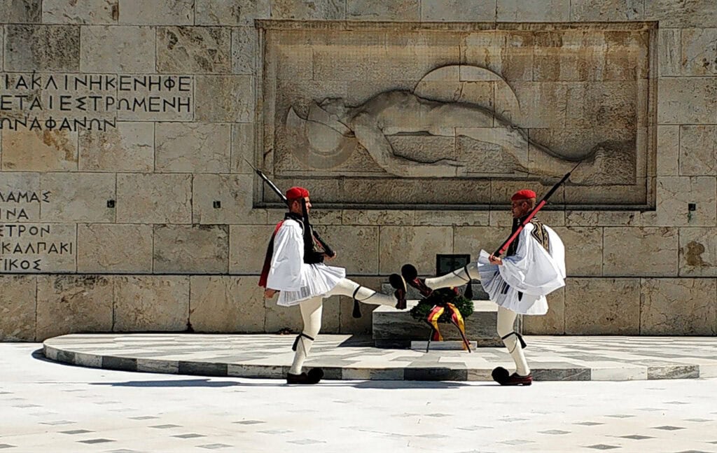 在憲法廣場的無名烈士墓 (Tomb of the Unknown Soldier) 前,24 小時都有衛兵駐守。他們不是普通的軍人,而是精挑細選出來的 Evzones (總統衛隊)。