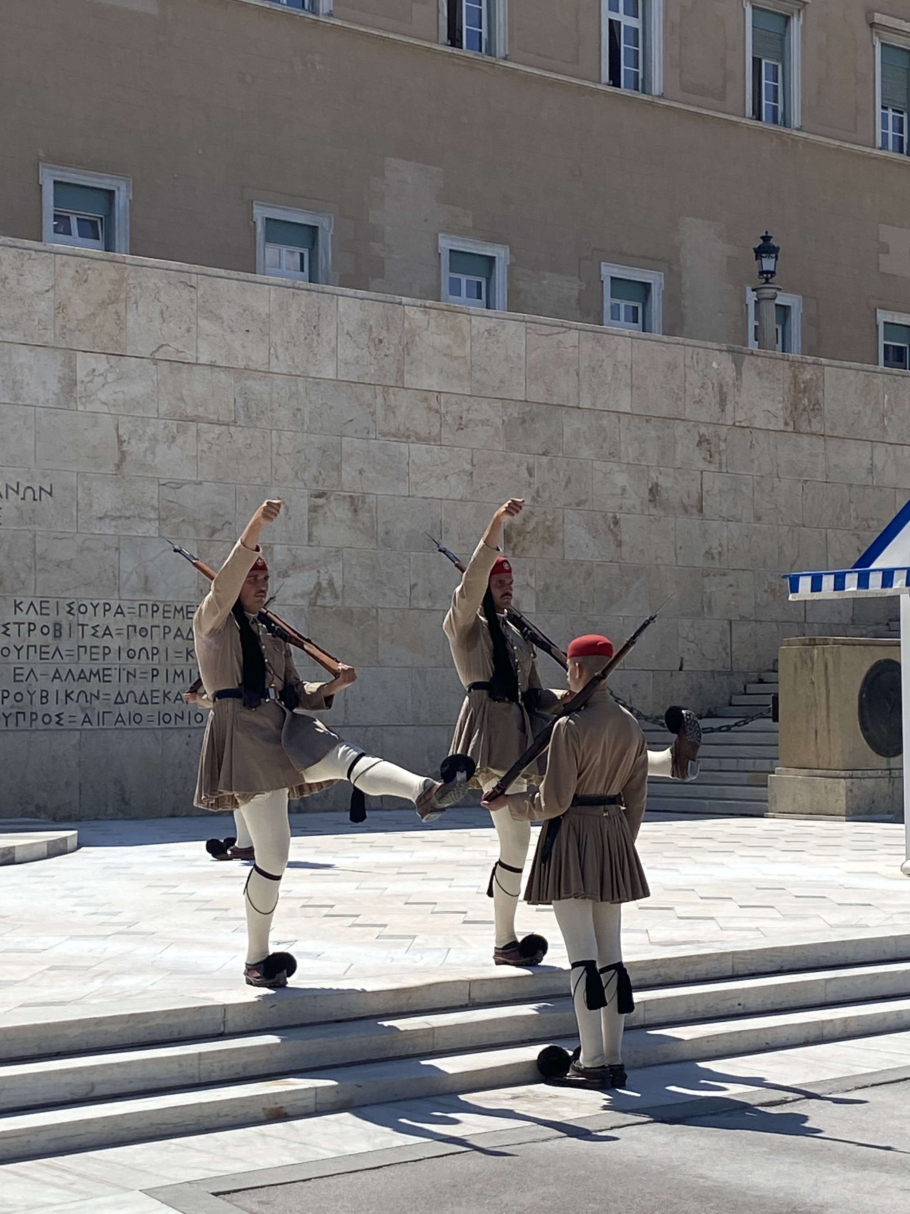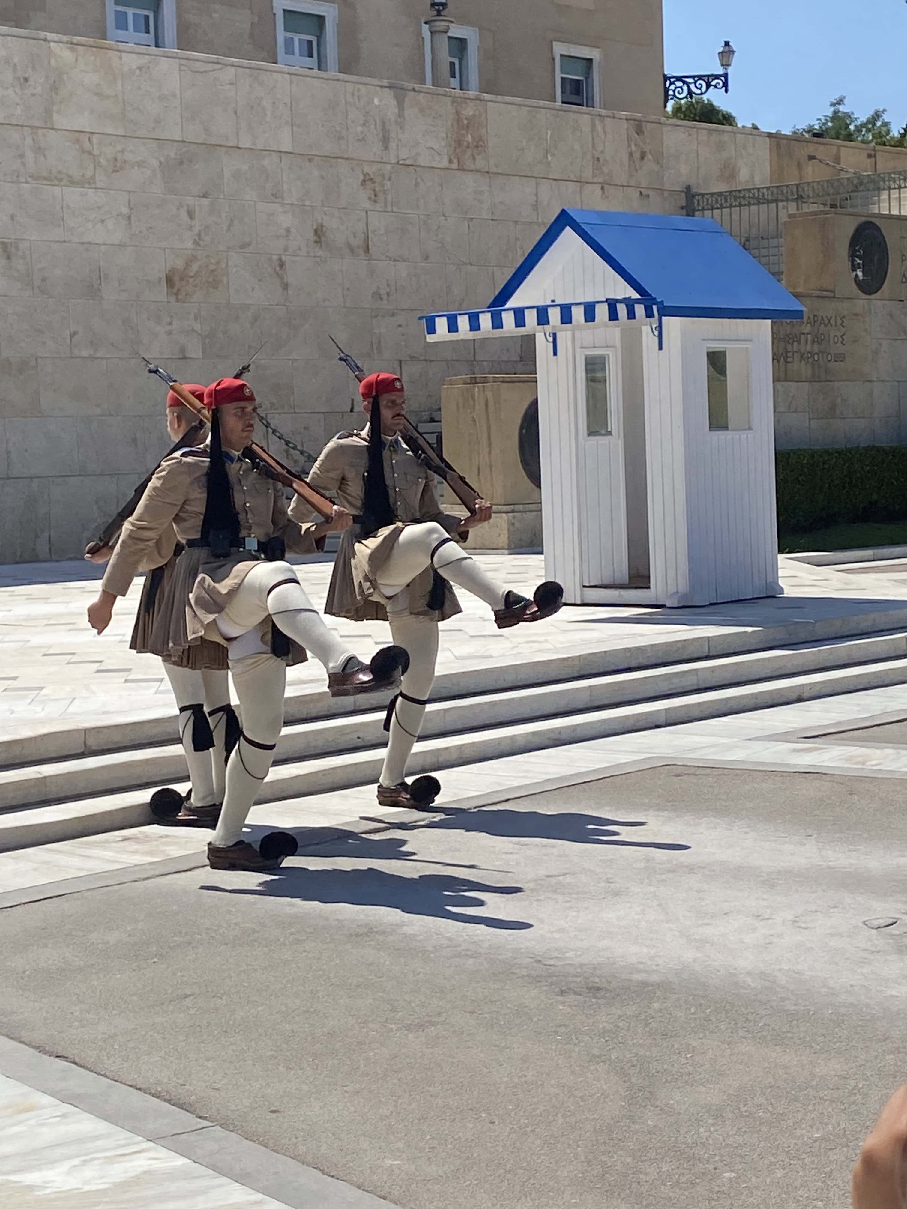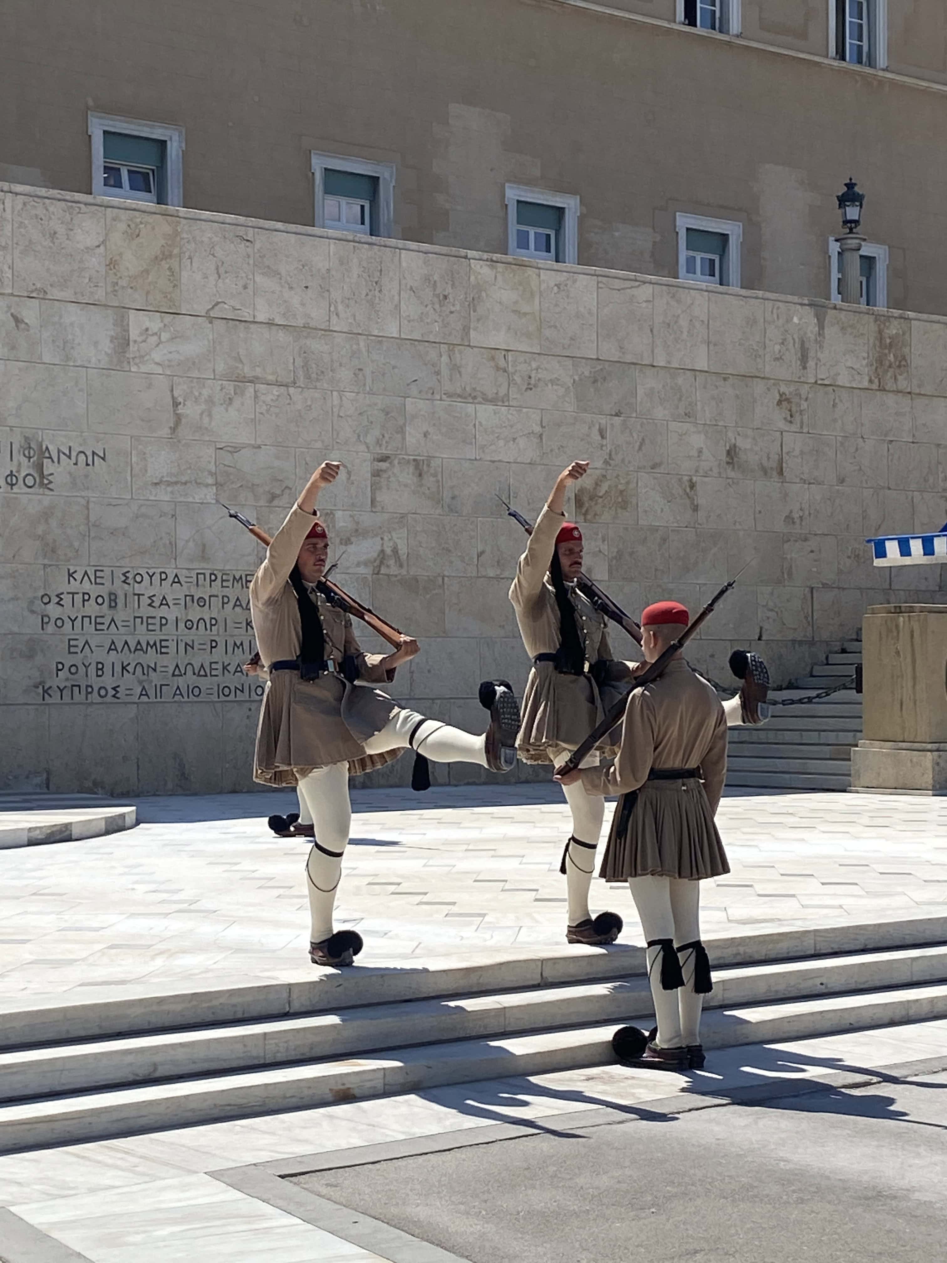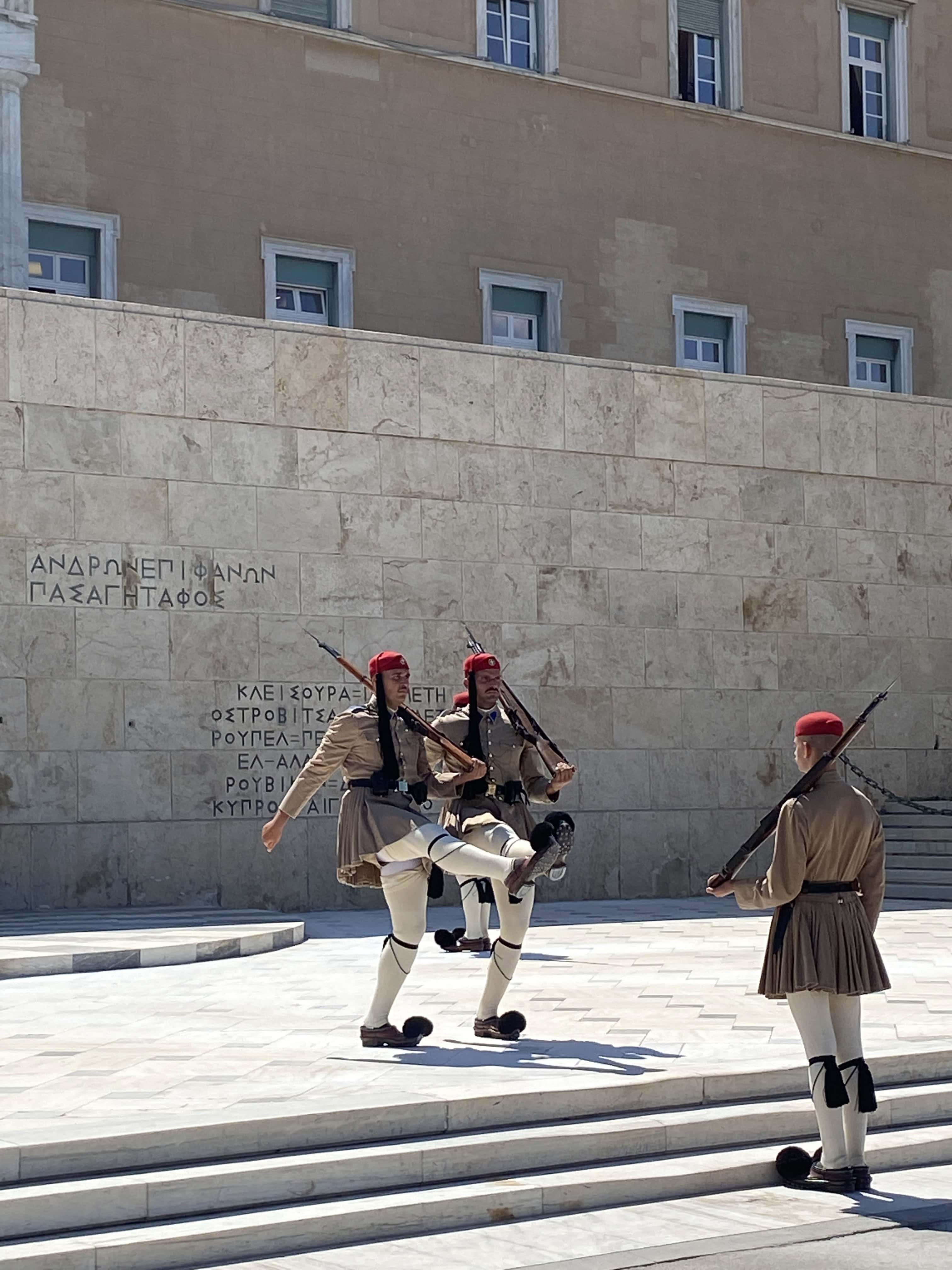 廣場不大,卻是觀光客必來景點之一,就是為了觀看每個整點舉行的衛兵交接儀式。士兵會穿著希臘傳統服裝,白色裙子、誇張的紅色帽子與外加很厚的褲襪,襪子的膝蓋位置有加厚,士兵在跨步時腳的跨度非常大,猶如在跳一種特殊舞蹈。