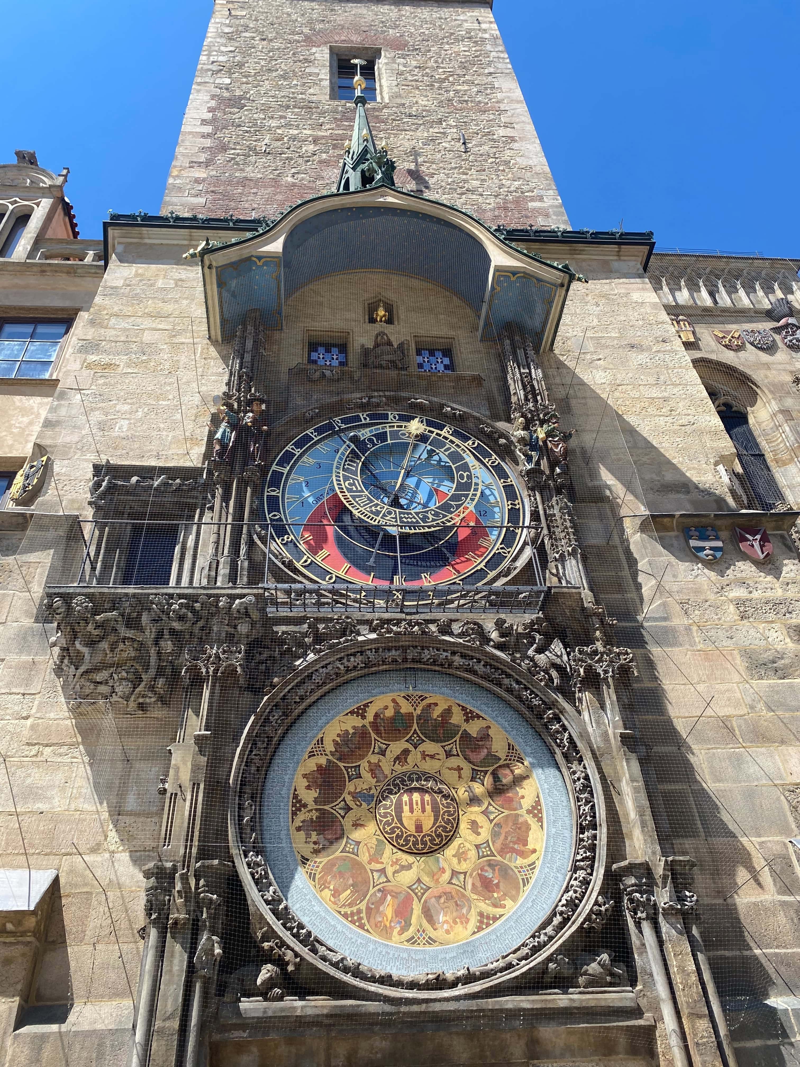 天文鐘是1410年建的自鳴鐘,採用地球是宇宙中心原理設計,上面的鐘一年繞一周,下面的一天繞行一圈。天文鐘分為三部分,第一層是天使跟金色公雞,第二層有十二星座代表月份、羅馬數字代表時間、阿拉伯數字代表舊波希米亞時間。每到整點,天文鐘上方的窗戶會打開,耶穌的十二門徒木偶會輪流現身,是廣場上最熱鬧的時刻。