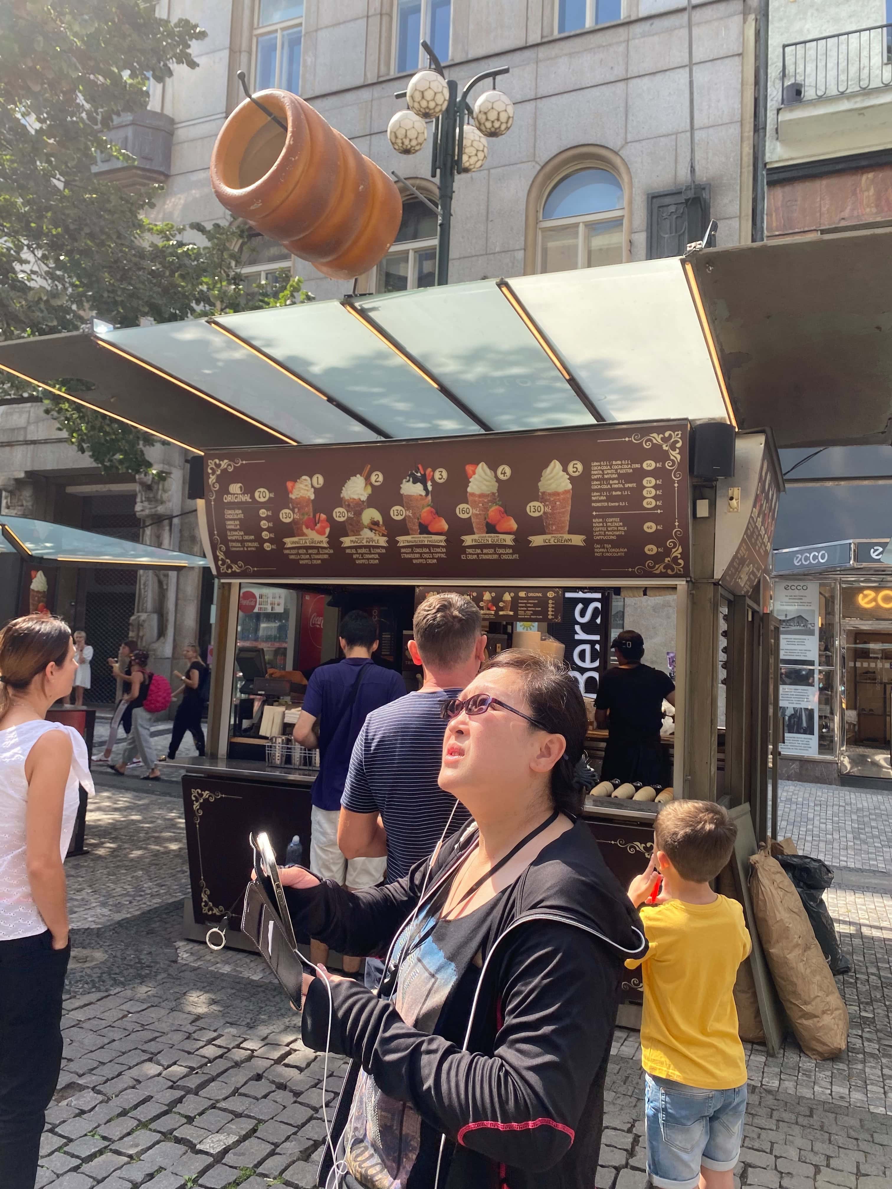 煙囪肉桂捲 Trdelníkk 主要是將麵團包在一根棍子上、在炭火上烤,撒上糖和香料,依照不同口味在卷裡面加入冰淇淋、草莓、鮮奶油、巧克力等,各種邪惡熱量炸彈。我和J媽就買了兩次冰淇淋口味,沒有想像中的死甜! 反而非常香脆,好吃!