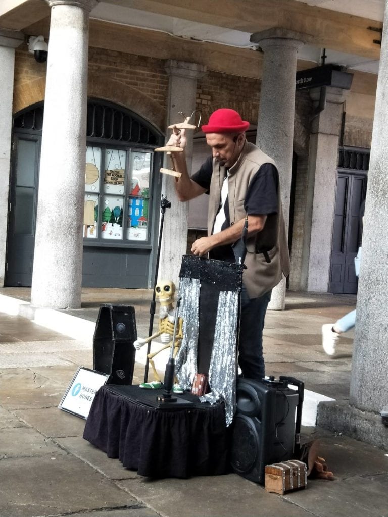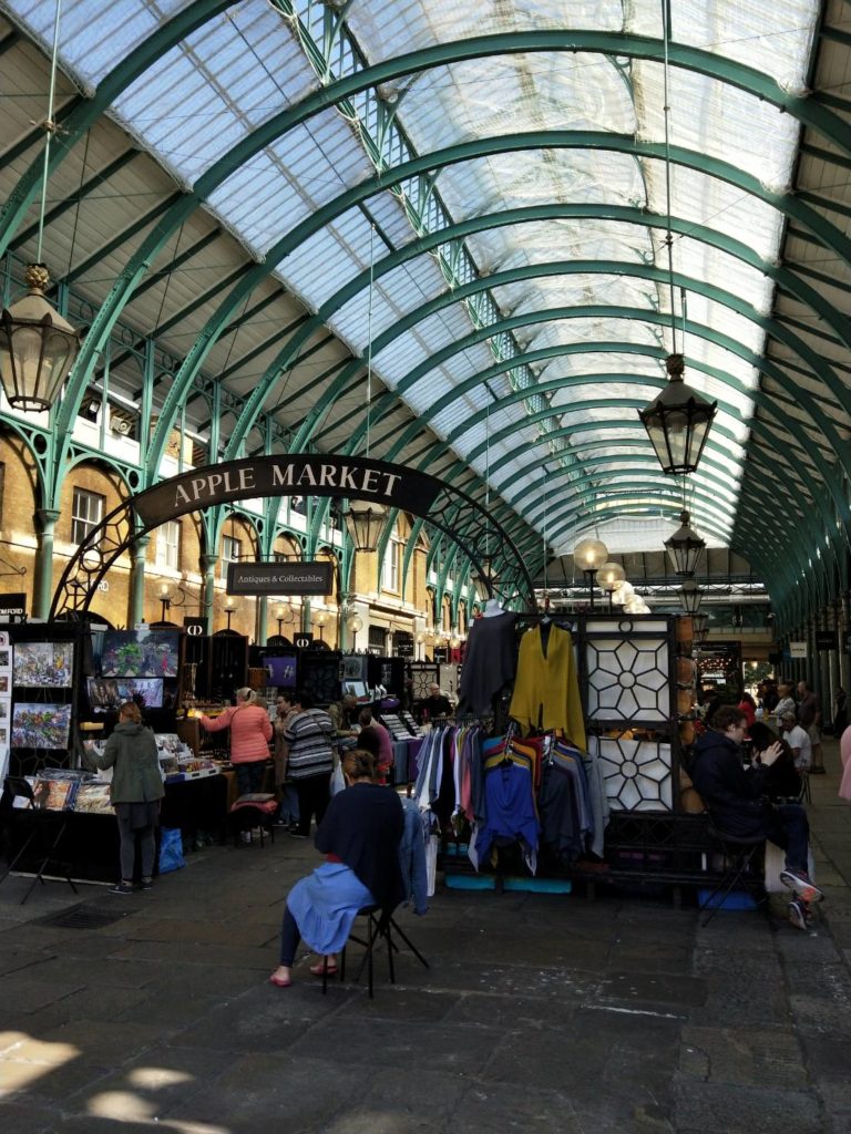 柯芬園一方面有各式市集、攤位,租給民眾來展售自己的商品,一方面一些知名的店家也在此設有攤位,諸如whittard、godiva等巧克力、茶、香水店等等。樓下餐廳不時邀請四人弦樂、歌唱家表演,廣場上有街頭藝人輪番上陣,附近不乏百貨精品店舖(鼎泰豐就在附近),充滿陽光的午後,總能看見歐洲各國的青年坐在地上與表演者互動、推著嬰兒車的父母或是來散步、逛市集的長輩們,非常愜意、很適合在這裡吃個中餐享受悠閒!(距離中國城也不遠,走路十幾分鐘就可以看到各式中超、餐館)
