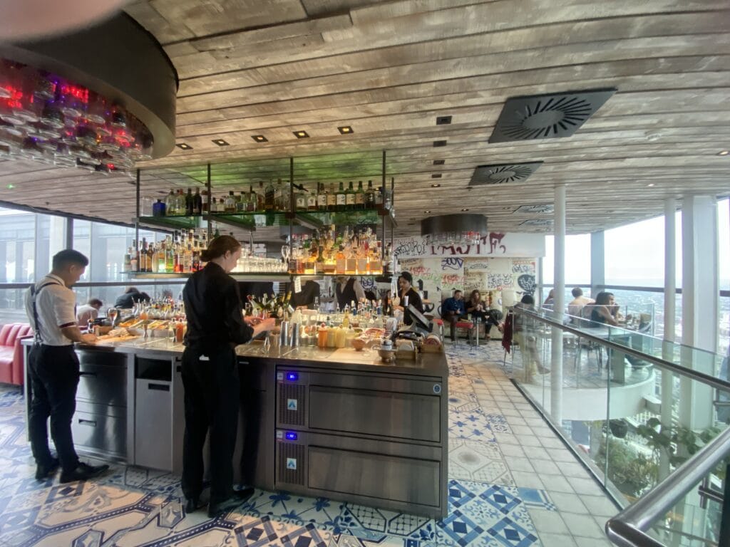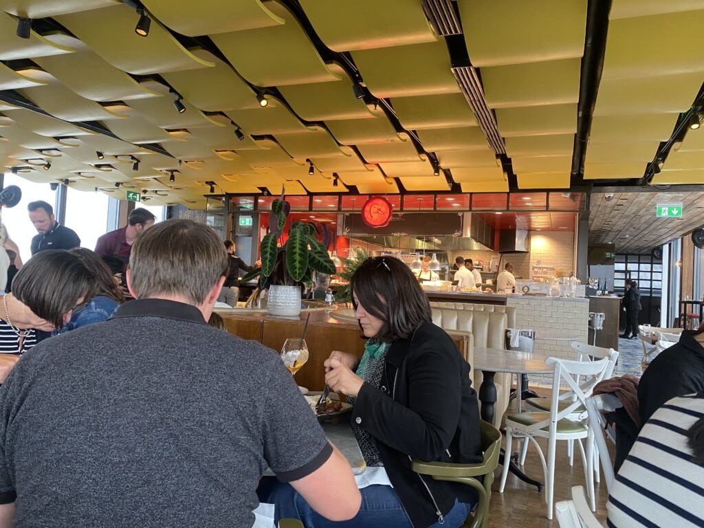 室內設計由著名的 CetraRuddy 操刀,融合現代工業風與復古元素。不對稱的格子天花板、塗鴉瓷磚與開放式廚房,營造出一種充滿活力的社交氛圍。由於 24 小時營業,無論清晨的倫敦日出、黃昏的金色時刻,或是深夜的萬家燈火,都是欣賞不同城市景觀的好餐廳選擇。