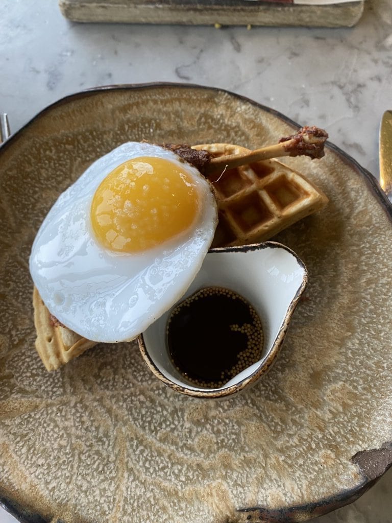 畢竟餐廳名稱就是DUCK & WAFFLE,來這裡必點的菜色之一就是鴨腿鬆餅啦!將脆皮油封鴨腿放在格子鬆餅上,頂端覆蓋一顆半熟煎鴨蛋,最後淋上帶有辛香風味的芥末楓糖漿。總體來說,我覺得表現中規中矩,是好吃的啦!