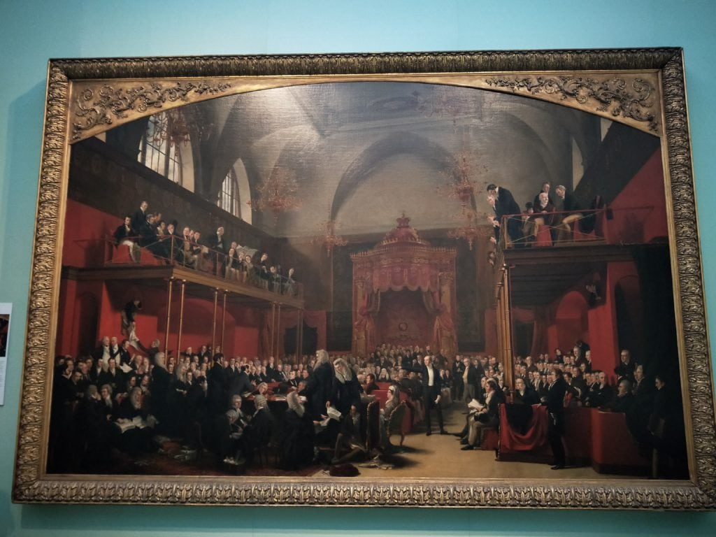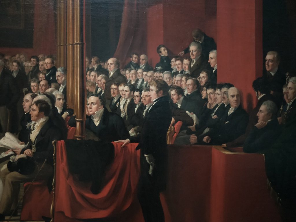 這幅畫描繪了1778年4月7日英國下議院中,威廉·匹特爵士在發表,支持和美國獨立革命派達成和平協議的演講後,於上議院倒下的場景。
