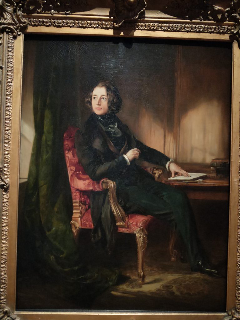 維多利亞時代英國最偉大的作家,生活見長的作家,父親因債務問題入獄後,狄更斯離開學校進入工廠工作。或許是由於這段經歷而看盡人情冷暖,狄更斯的作品流露出對底層社會生活狀態的體悟,與為兒童權利與教育的關注。著名作品有《塊肉餘生錄》、《遠大前程》、《孤雛淚》、《尼可拉斯·尼克貝》和《小氣財神》與《雙城記》等。今(2020)年,正好是狄更斯150年冥誕,而畫中的青年則是正出版《尼可拉斯·尼克貝》的狄更斯~