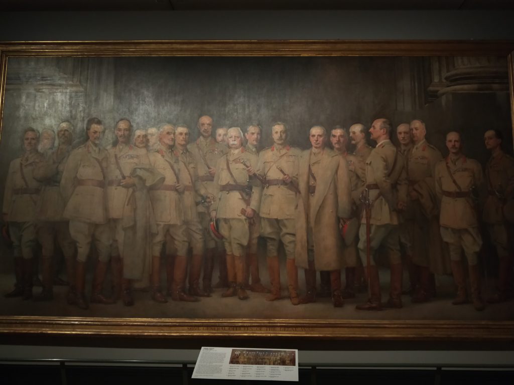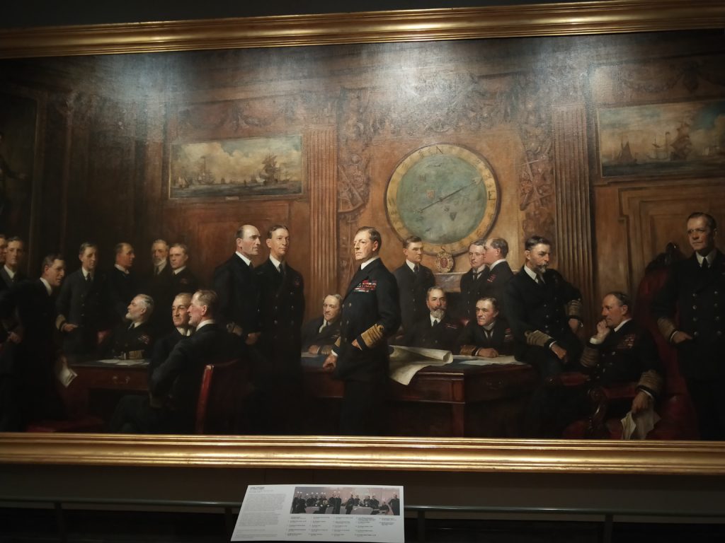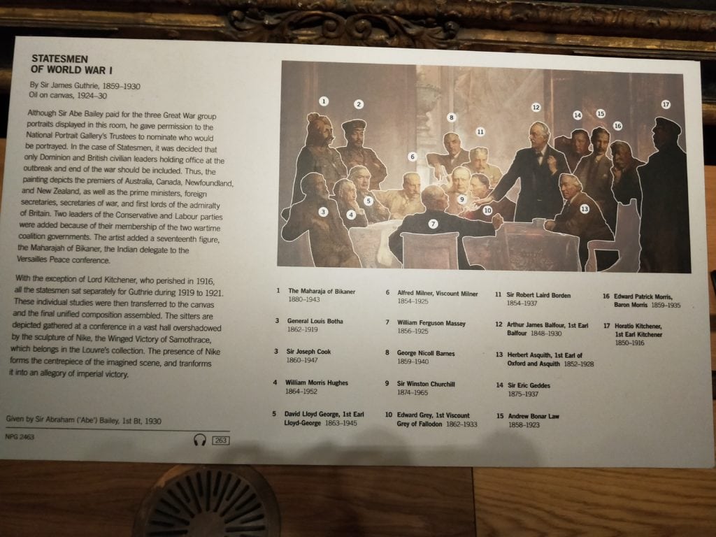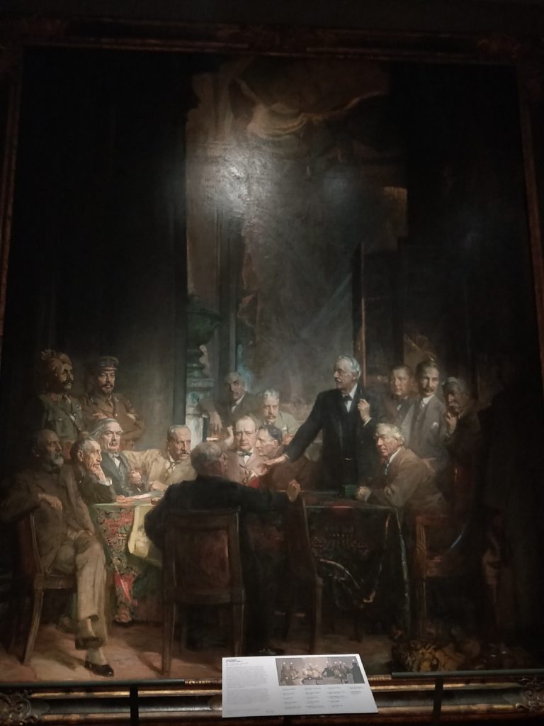 當時畫作完成時,邱吉爾的聲譽還未從他與1915年達達尼爾海峽災難性海軍進攻事件恢復。在右邊,賈巴爾·赫伯特·基奇納站在陰影中,與其餘的人略有分離,這個位置可能是因為基奇納的肖像是死後留下的,他已於1916年在他的巡洋艦HMS漢普郡上遇難。