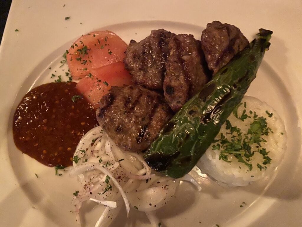 - traditional Turkish dish of minced beef & lamb, grilled pepper, onion salad and tomato with pilaf and chilli sauce