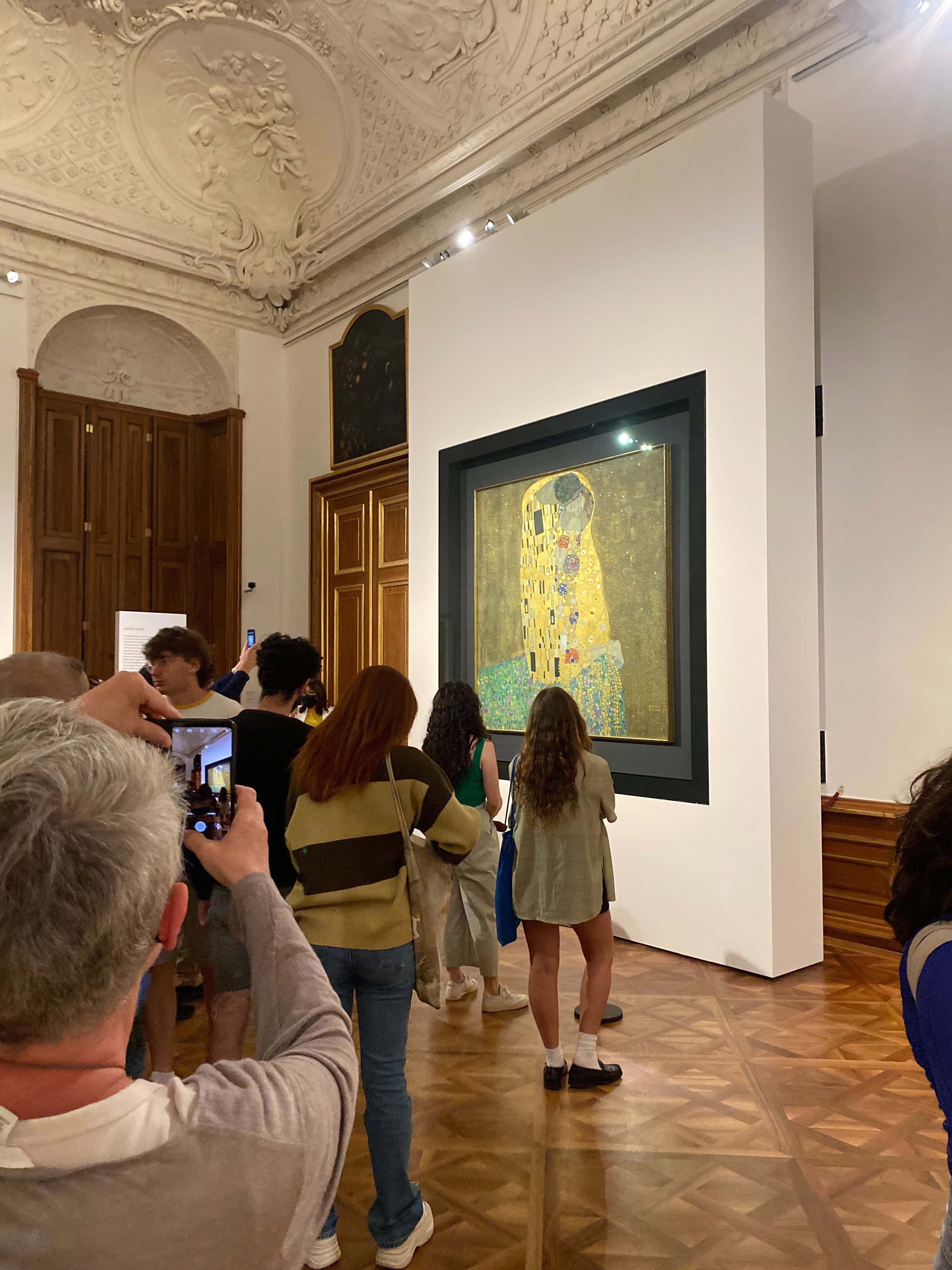 美景宮的必看經典!古斯塔夫·克林姆 (Gustav Klimt) 用大量的金箔與油彩,描繪了一對在花草地上深情擁吻的戀人。
