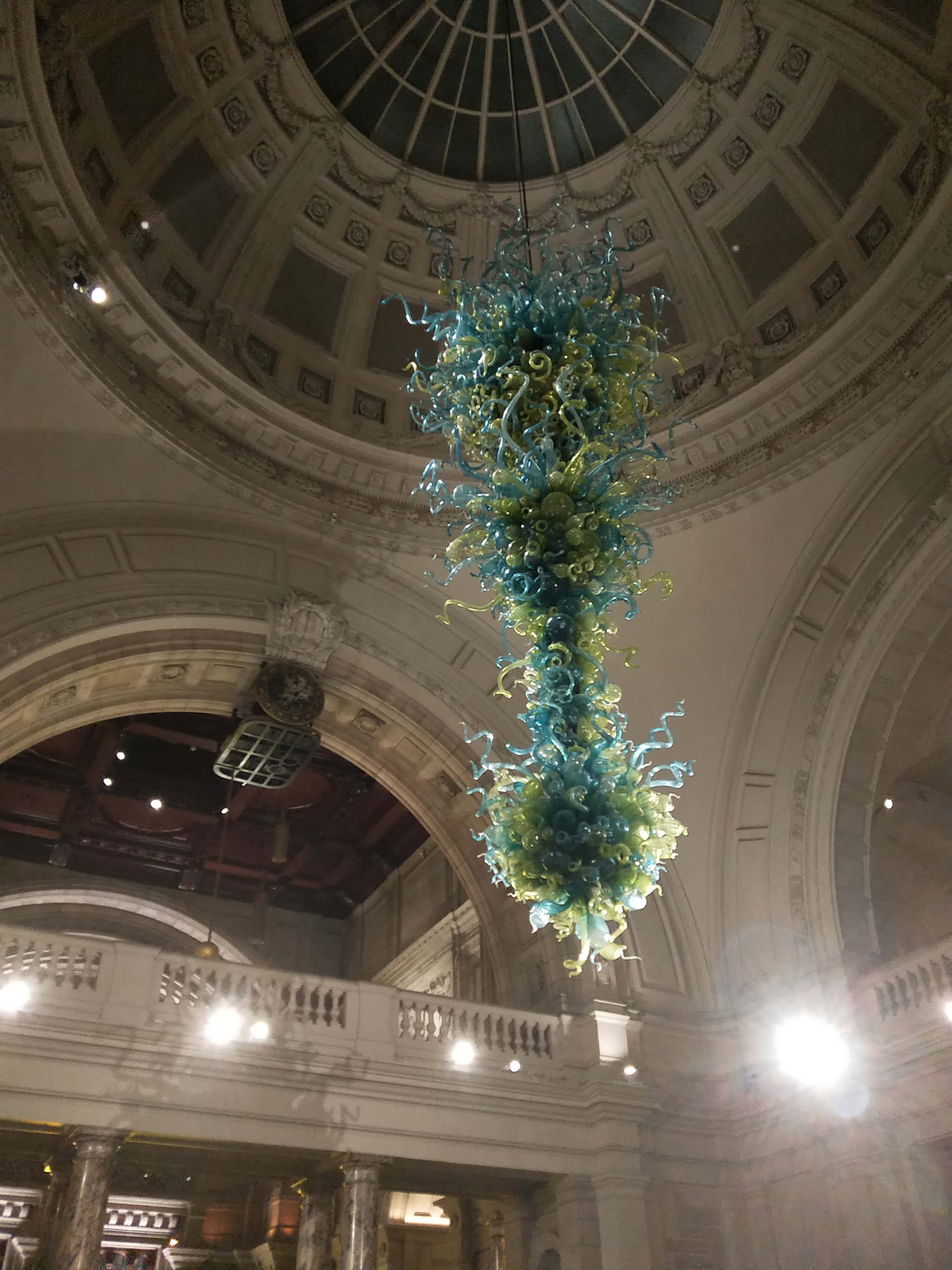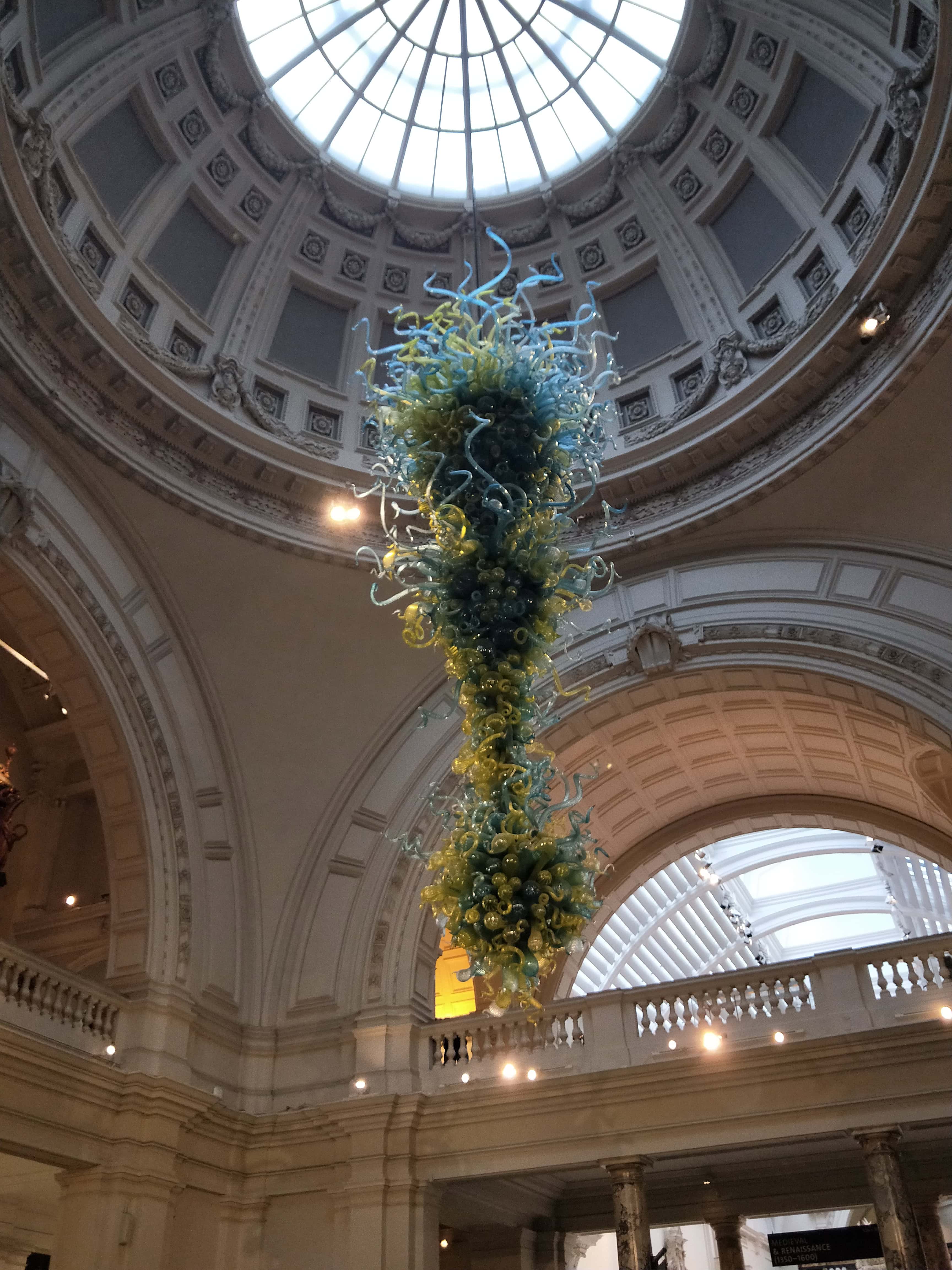 這座巨大的藍綠色吹製玻璃吊燈是 V&A 的視覺門面,不僅展現了現代工藝的極限,更像是深海生物般懸浮在古典建築中,是每位遊客入館後的第一個驚嘆號。